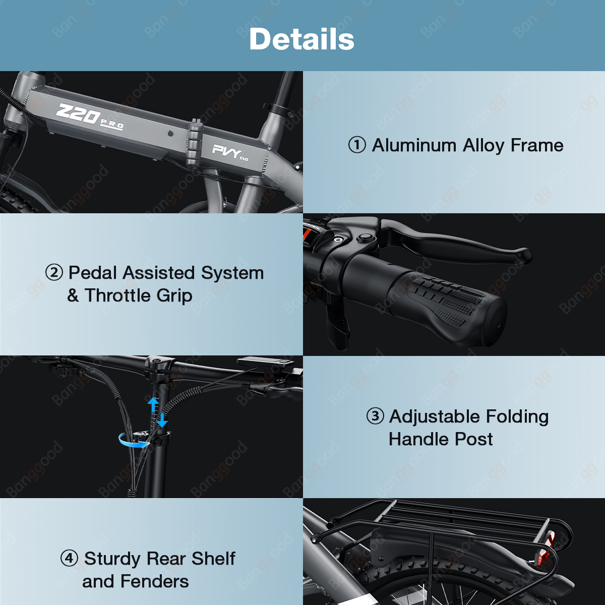 PVY Z20 PRO EVO on taitettava sähköpyörä, jossa yhdistyvät kompakti koko, mukava ajo ja käytännöllinen varustelu. Teräsjousitettu etuhaarukka, mekaaniset levyjarrut ja 20*2.125-tuumaiset ilmakumit tarjoavat varmuutta kaupunkiajossa. 36V 14.5Ah akku ja älykäs poljinavustus (PAS) tuovat pitkän toimintamatkan arjen ja vapaa-ajan ajoihin.