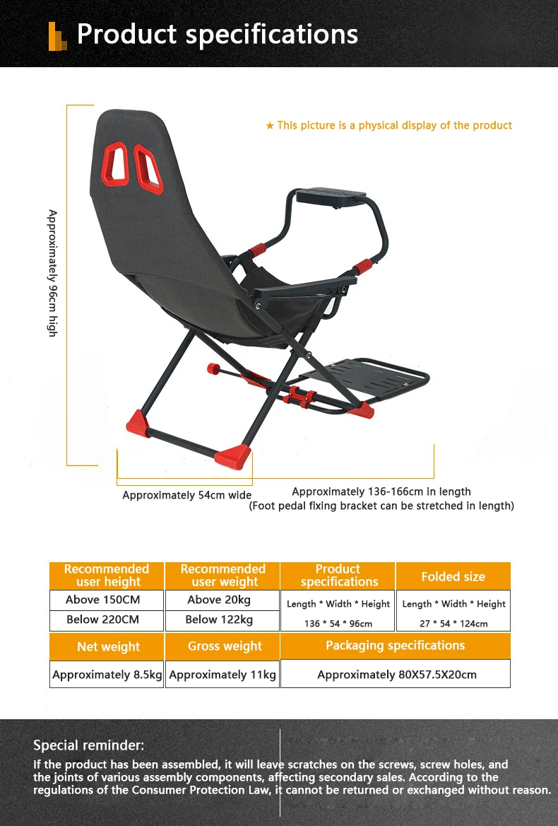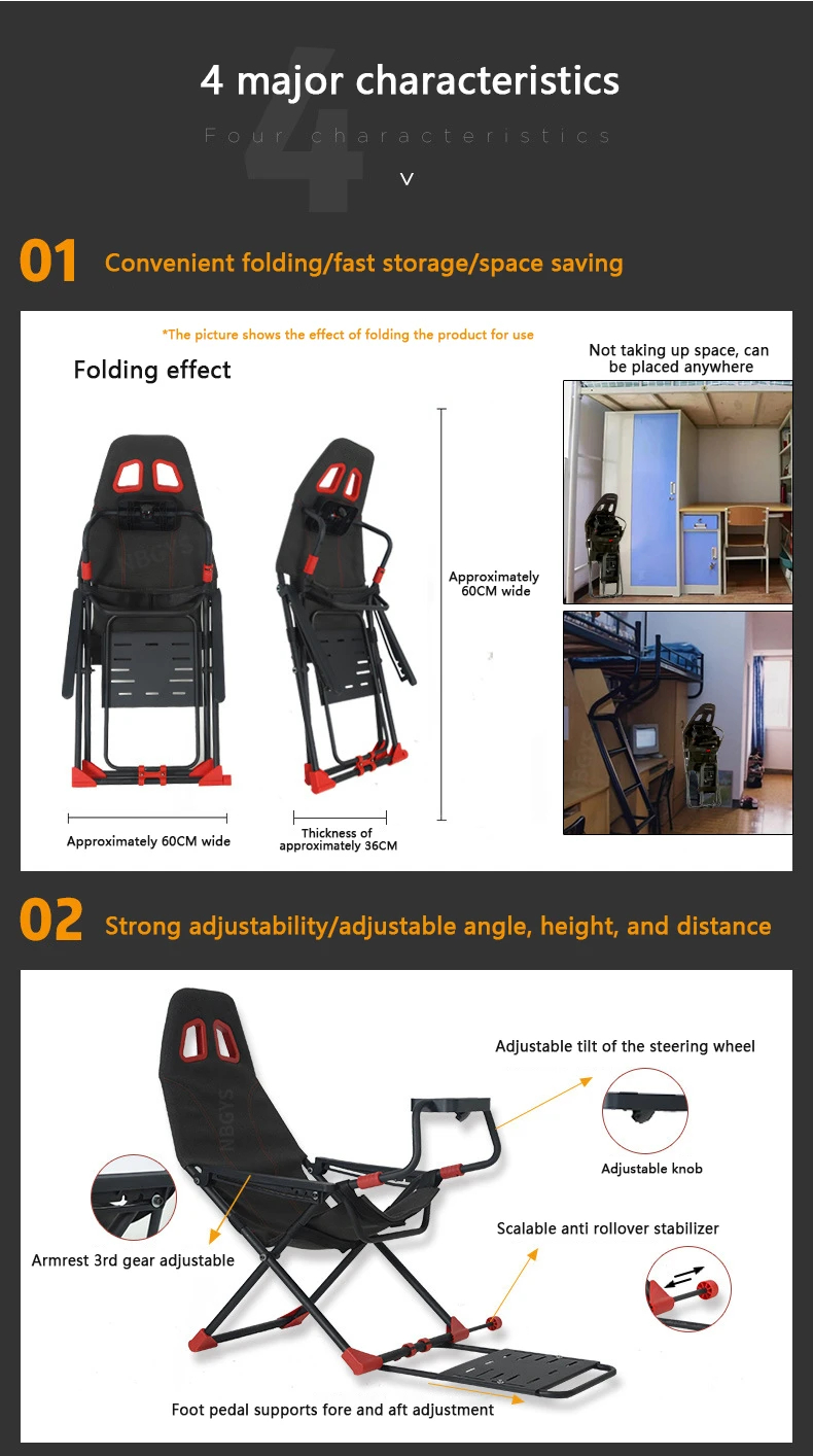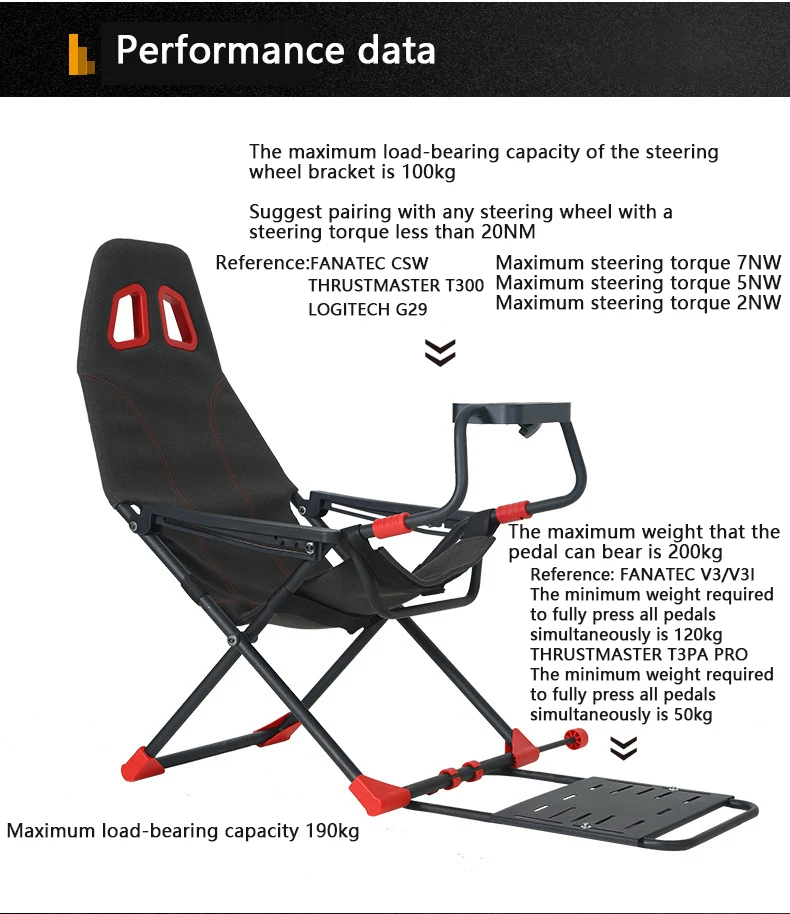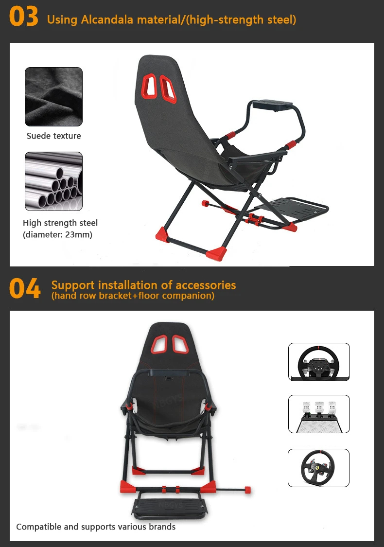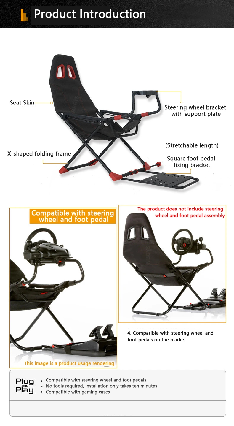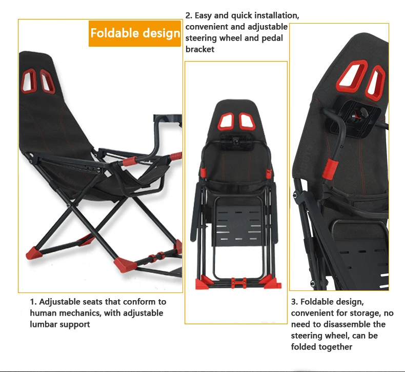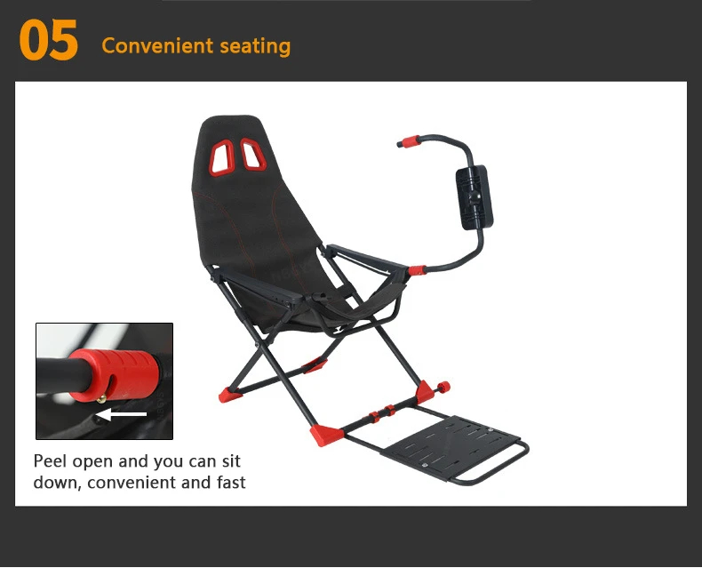 Monipuolinen ja kokoontaitettava ajosimulaattorin teline kotikäyttöön. Vahva teräsrunko, pehmeästi viimeistelty istuinmateriaali ja laajat säätömahdollisuudet tekevät ajamisesta mukavaa ja vakaata myös pitkissä sessioissa.