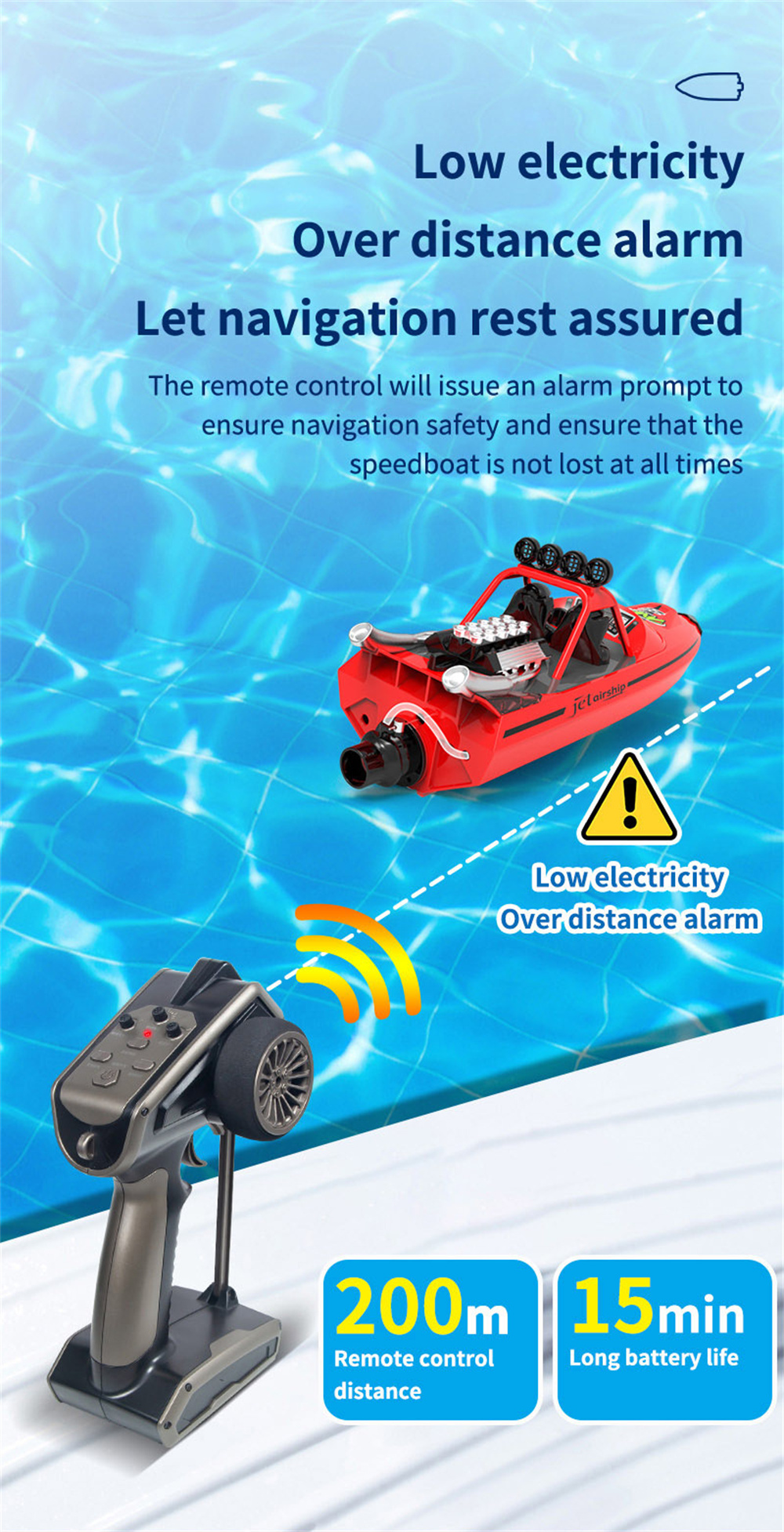 Alhaisen virran ja etäisyyden hälytys: kauko-ohjain antaa hälytyksen akun varaustason tai etäisyyden ollessa kriittinen, mikä lisää turvallisuutta ja auttaa estämään veneen katoamisen.