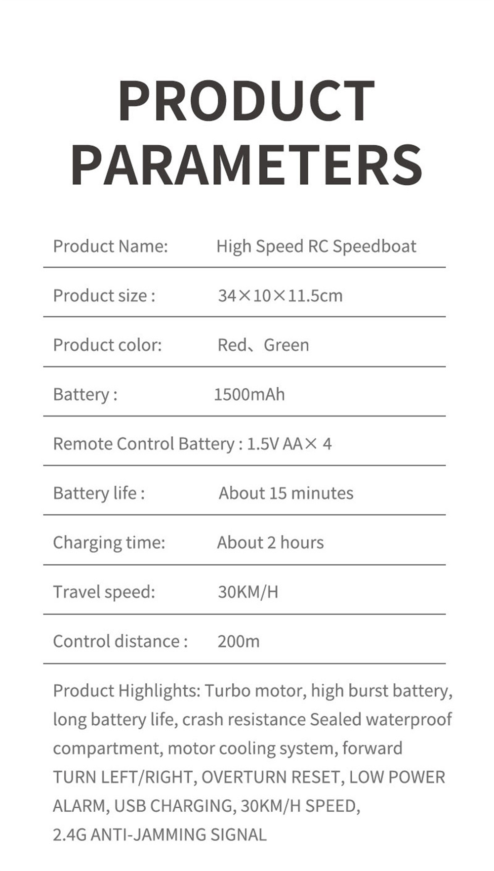 Eteen- ja taaksepäin ajo, kääntyminen vasemmalle ja oikealle, LED-valo, alhaisen akun varoitus, kaatuneen veneen oikaisu, automaattinen esittelytoiminto