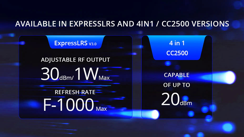 - Saatavana sisäänrakennetulla ExpressLRS- tai 4-in-1/CC2500-moniprotokollamoduulilla