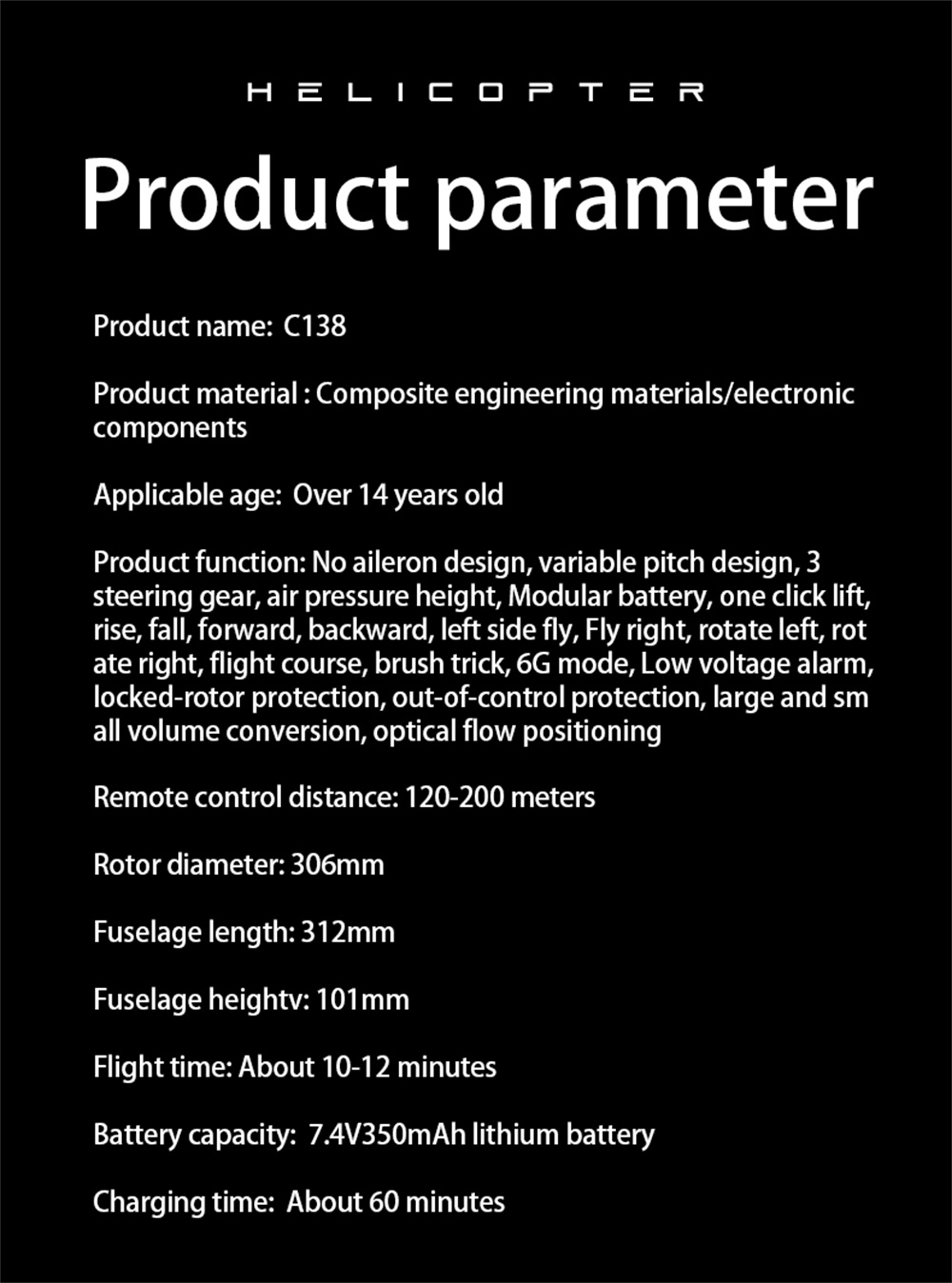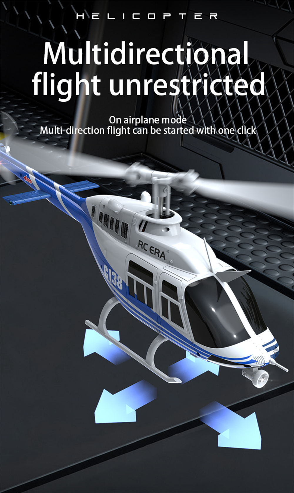 RC ERA C138 on 6-kanavainen flybarless RC-helikopteri, jossa on 6-akselinen gyroskooppi ja korkeuspidon mahdollistava barometri. Malli tarjoaa vakaan lennon aloittelijoille sekä 3D-liikkeet kokeneemmille harrastajille.