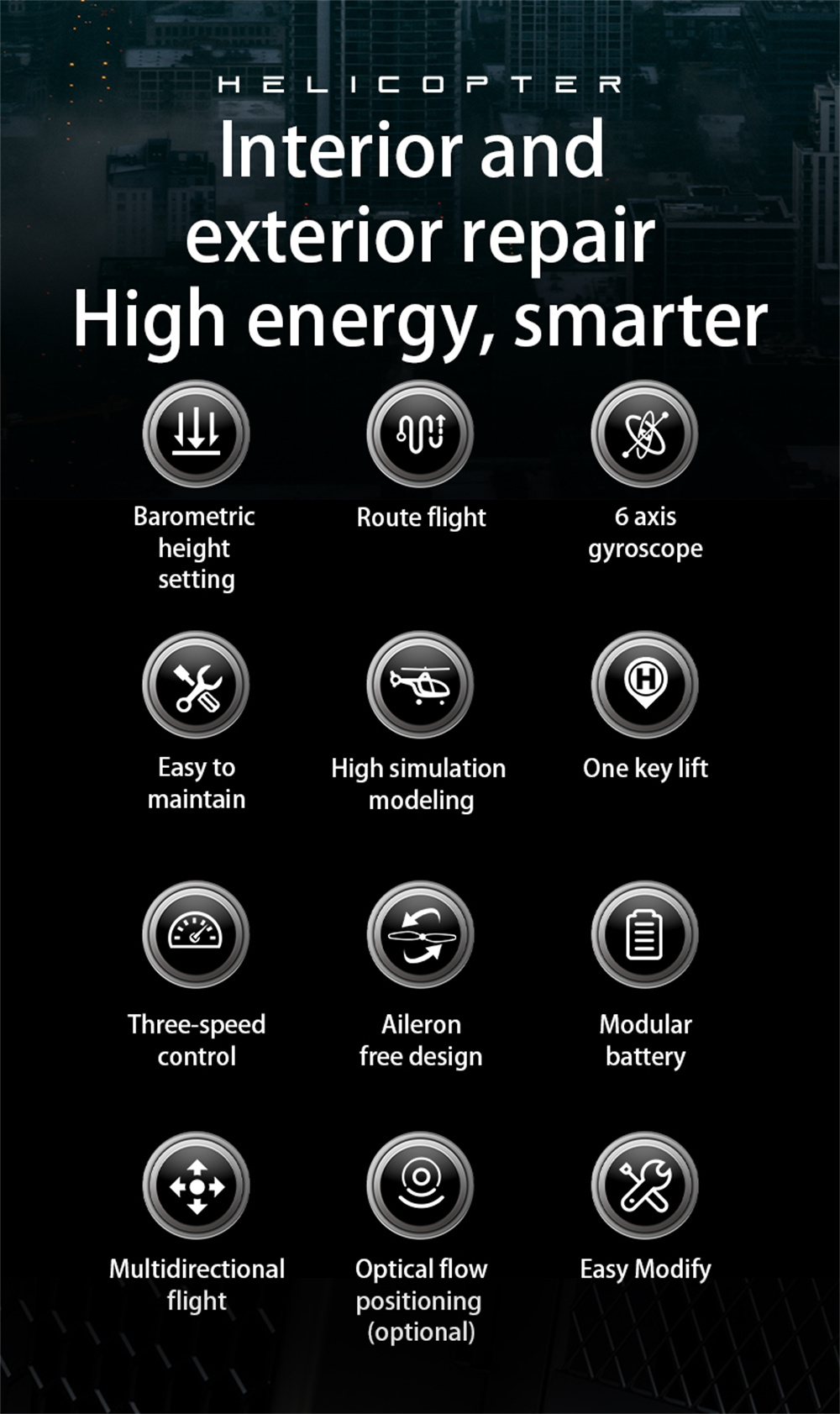 - Flybarless-rakenne, jossa potkurit on suunniteltu aerodynamiikan periaatteiden mukaan tuottamaan vahva teho ja hyvä itsevakautuvuus. 6-akselinen gyroskooppi erittäin vakaaseen lentoon.