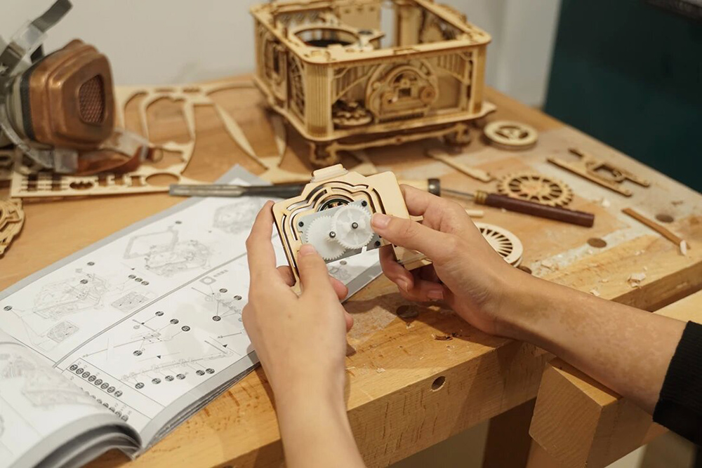 - 424-osainen puinen 3D-rakennussarja ilman liimaa ja työkaluja.