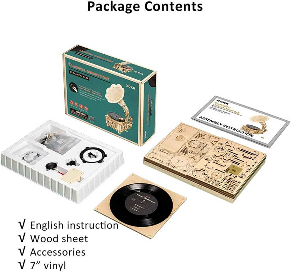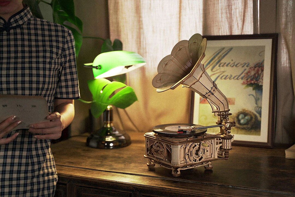 Robotime käsivetoinen klassinen gramofoni 424 osaa puinen rakennussarja musiikilla lahjaksi lapsille ja aikuisille kotiin