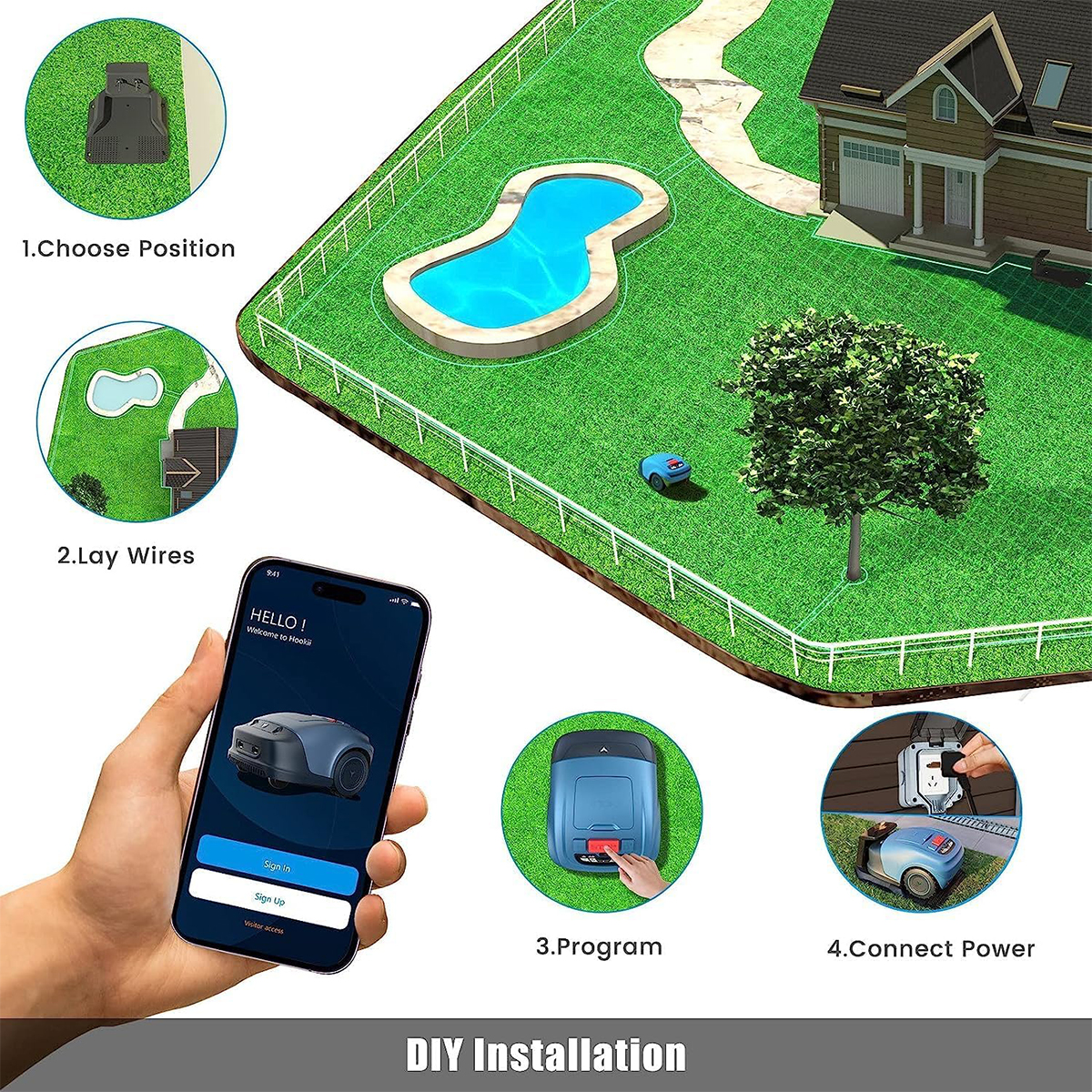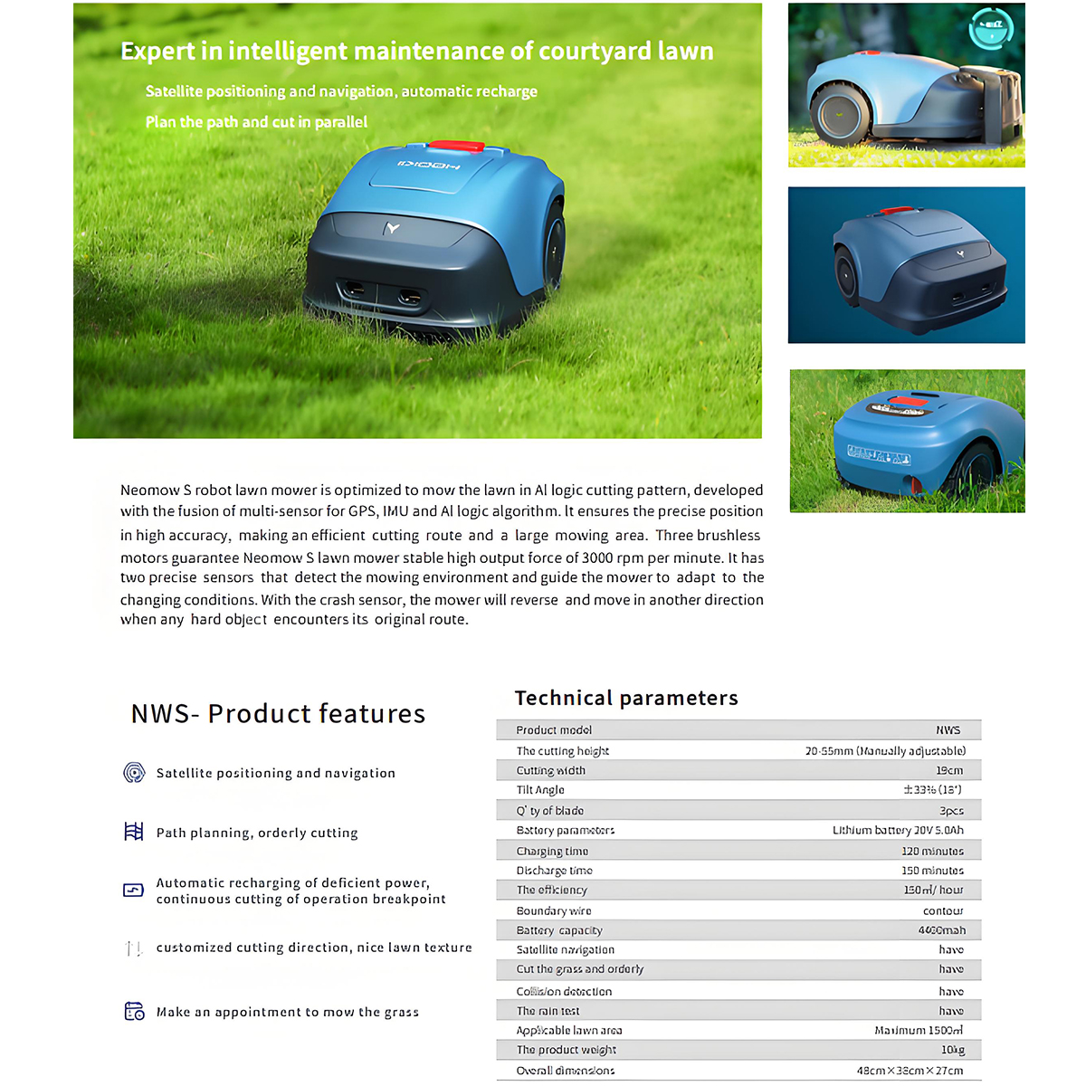 Tämä robottiruohonleikkuri hoitaa nurmikon leikkuun automaattisesti edistyneen satelliittipaikannuksen, monianturijärjestelmän ja tekoälyyn perustuvan reittisuunnittelun avulla. Harjattomat moottorit takaavat tasaisen leikkuutehon, ja törmäys- sekä ympäristöanturit huolehtivat turvallisesta ja olosuhteisiin mukautuvasta toiminnasta.
