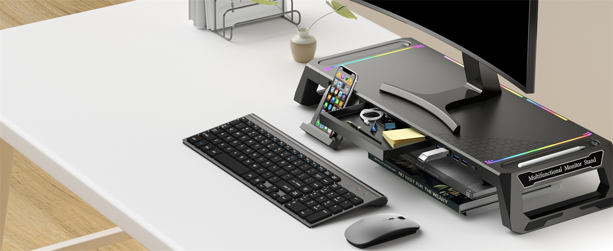 3. Monikäyttöinen säilytys: Sisäänrakennettu puhelinteline ja tilavat säilytyslaatikot pitävät työpöydän järjestyksessä.