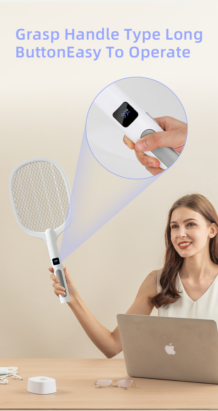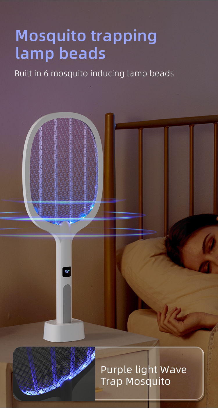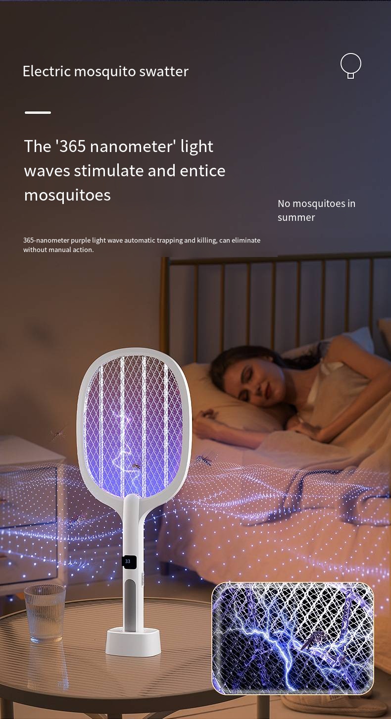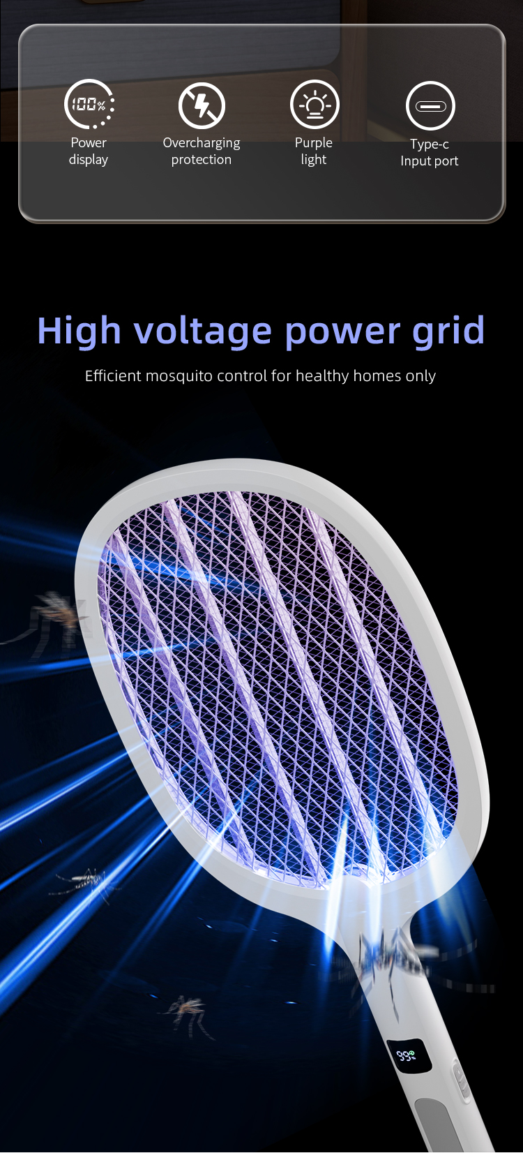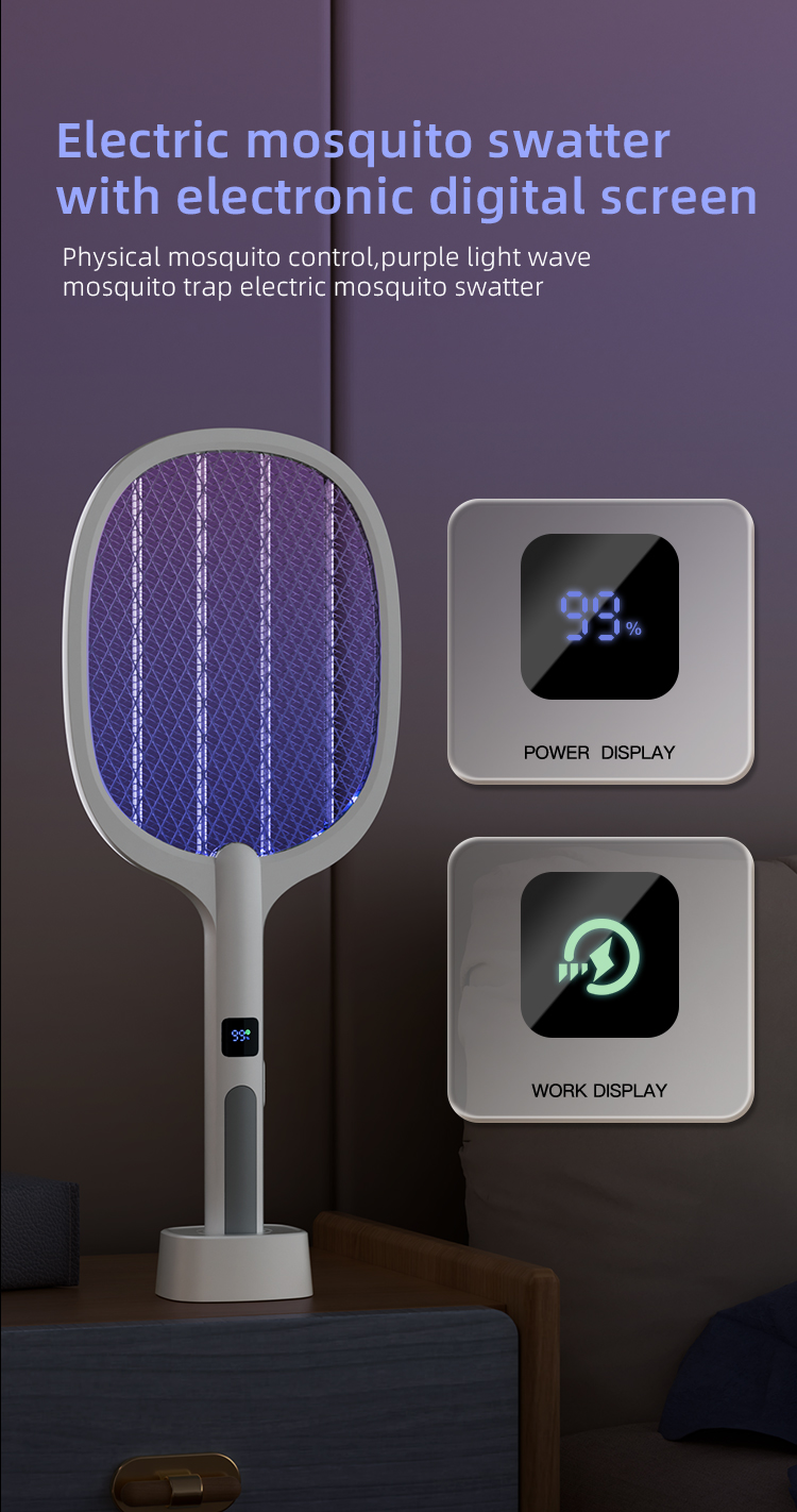 Sähköinen hyttysläppä digitaalisella näytöllä, C-tyypin ladattava, violetti valonauha ja automaattitila