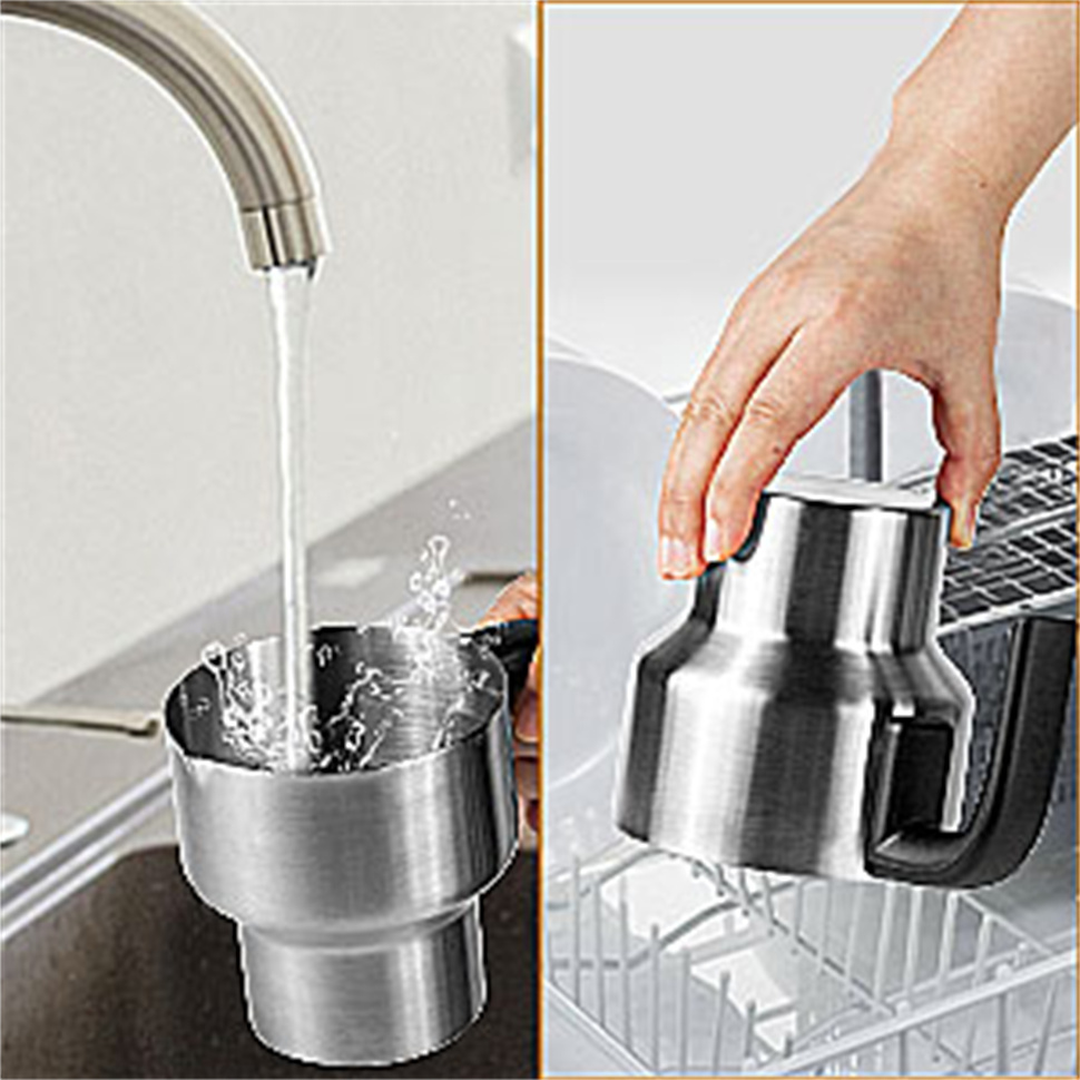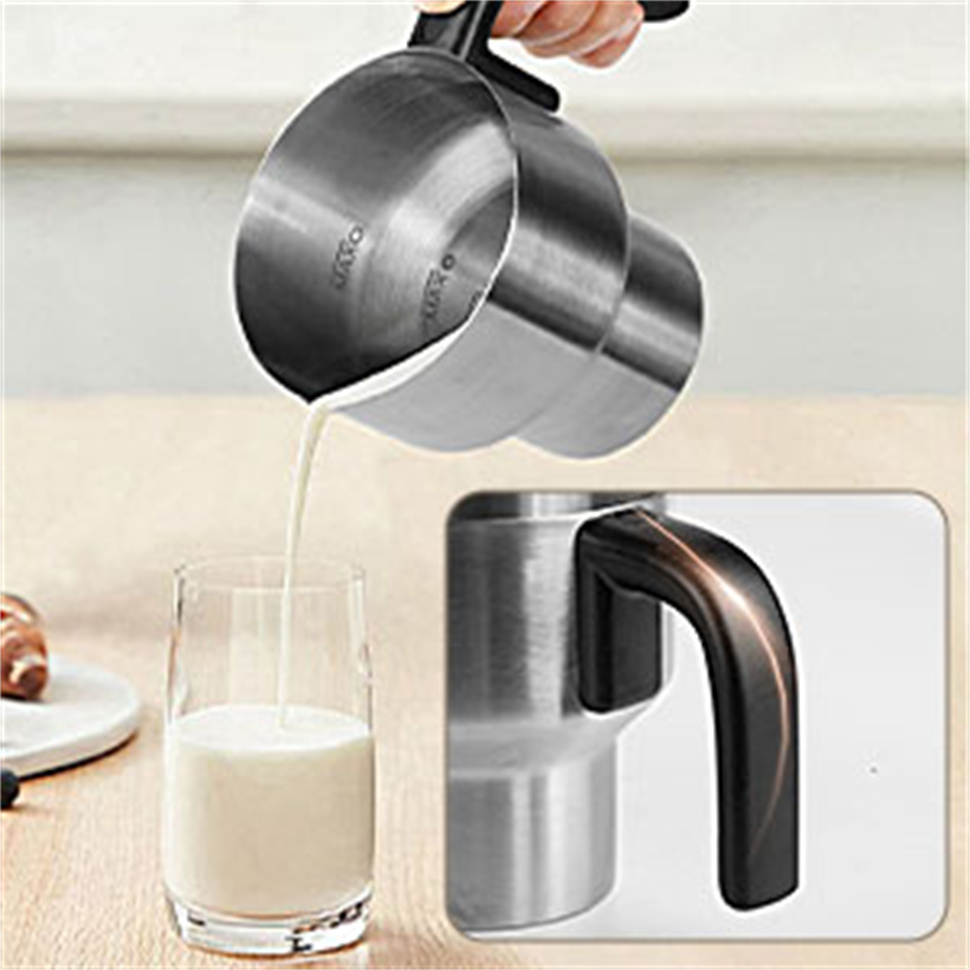 Vaahdottimen kuppi on elintarvikekelpoista 304-ruostumatonta terästä. Irrotettava rakenne helpottaa puhdistusta, ja kaatonokan muotoilu mahdollistaa roiskumattoman kaatamisen.