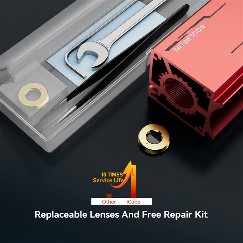 8- Vaihdettava laserlinssi: Vaihdettava linssi pidentää laserpään käyttöikää. Linssin voi vaihtaa, jos se vaurioituu tai likaantuu pitkän käytön jälkeen.