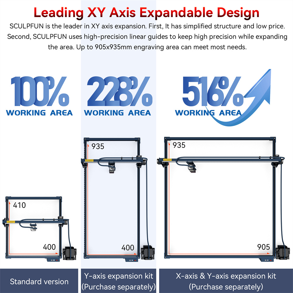 5. Laajennettava kaiverrusalue molemmilla XY-akseleilla: voit hankkia Y-akselin laajennussarjan kasvattaaksesi alueen 935x400mm:iin tai XY-akselin laajennussarjan jopa 935x905mm:n työalueeseen suuria töitä varten.