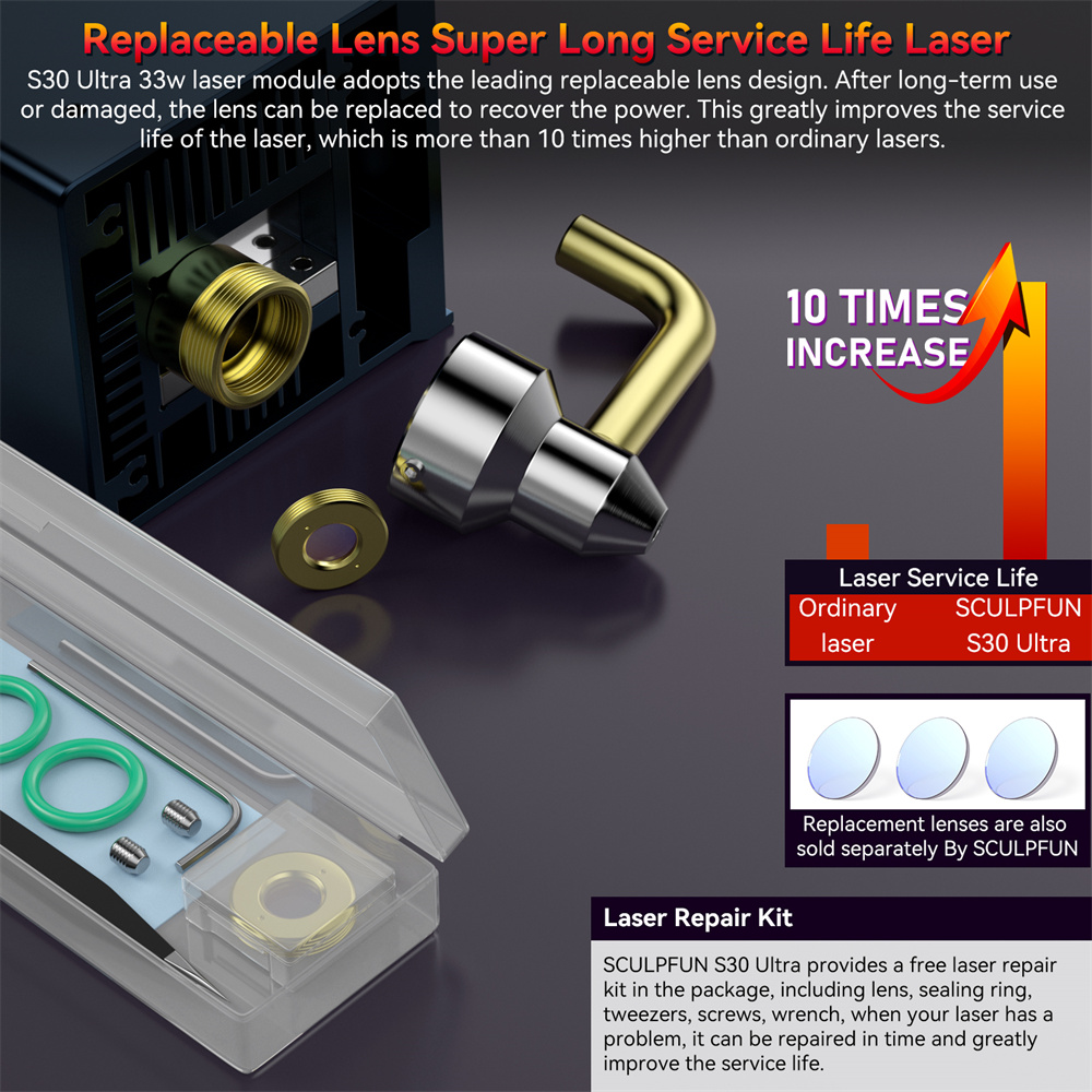 7. Vaihdettava suojalinssi: pidentää laserin käyttöikää yli 10-kertaiseksi moniin yleislasereihin verrattuna. Linssi on vaihdettavissa kulumisen tai vaurion jälkeen. Pakkauksessa 1 ilmainen linssi, lisälinssejä saatavilla SCULPFUNilta.