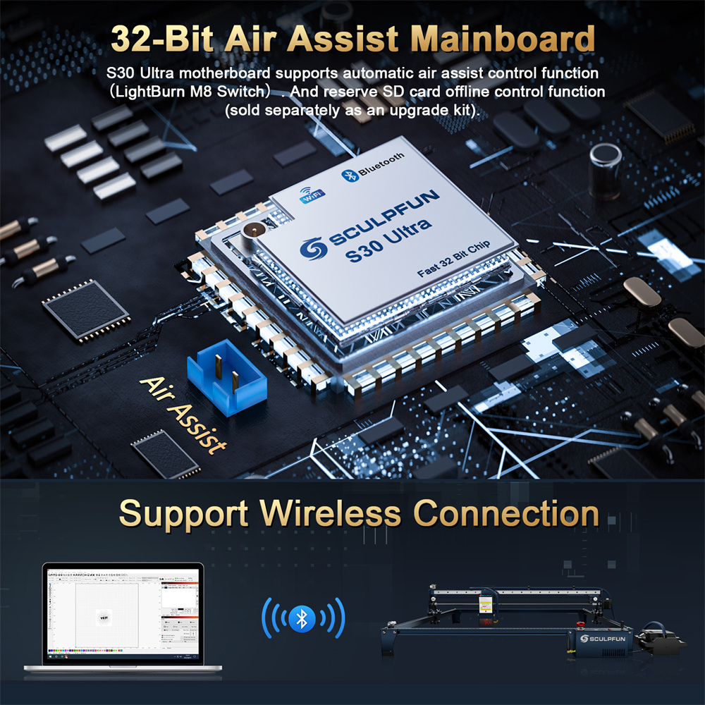SCULPFUN S30 Ultra-33W automaattinen laserkaiverruskone 600x600 mm ilma-avusteinen vaihdettavalla linssillä