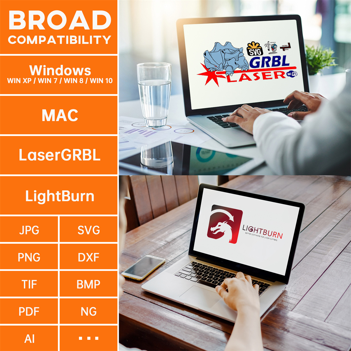 Toimintaohjelmisto: LaserGRBL, LightBurn, Benbox, GrblController, LiteFires, tukee Windows-järjestelmää, tukee MAC-järjestelmää. Tuetut tiedostomuodot: NC, BMP, JPG, PNG, DXF ja muut kuvaformaatit.