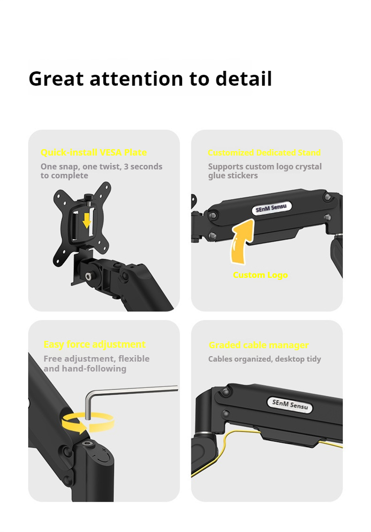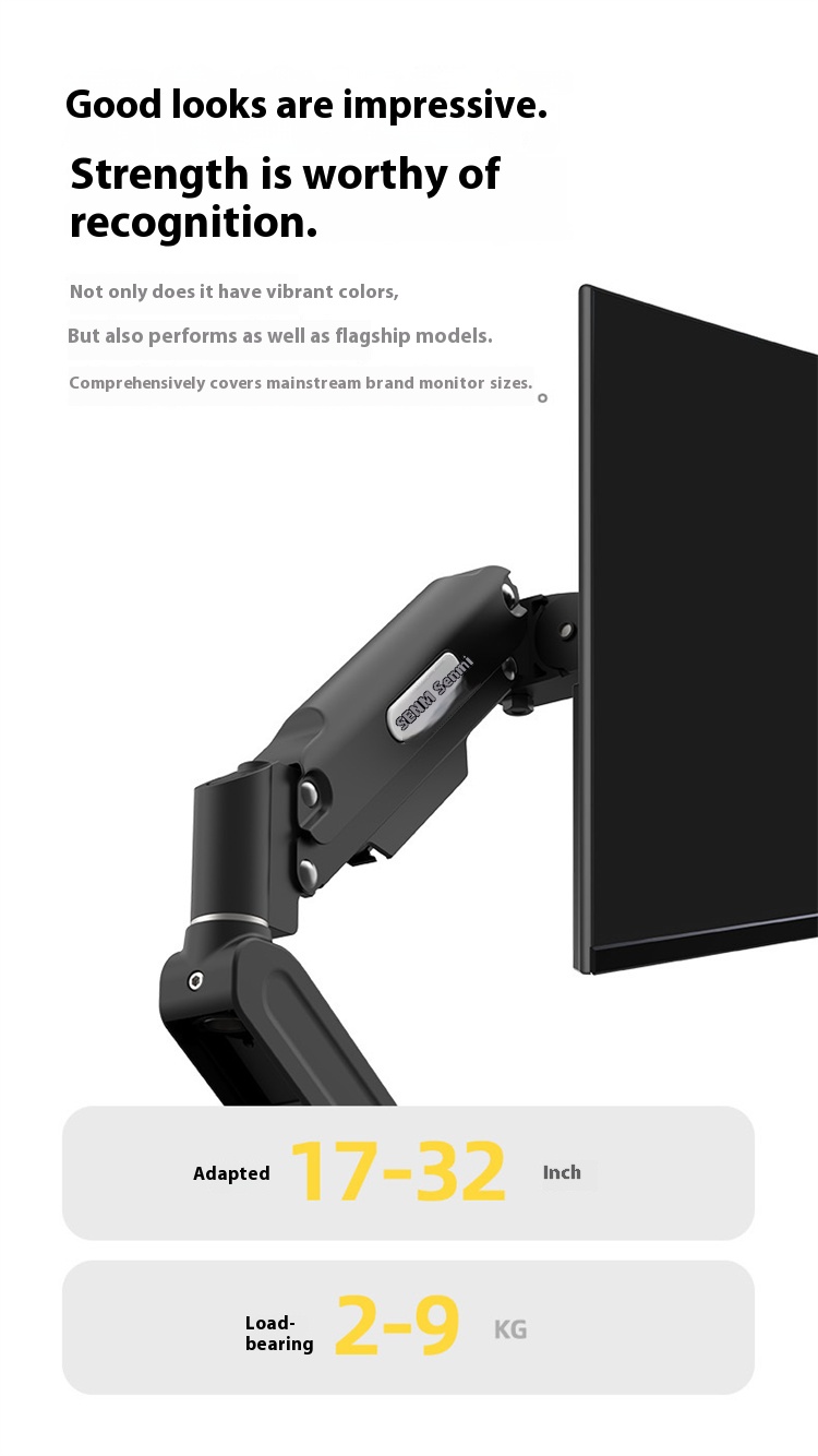 SENMI PS70 on säädettävä yhden näytön varsi 17–32 tuuman näytöille. Kaasujousen tuella se tarjoaa sujuvan korkeussäädön, laajat kulmasäädöt ja siistin kaapeloinnin ergonomiseen työpisteeseen.