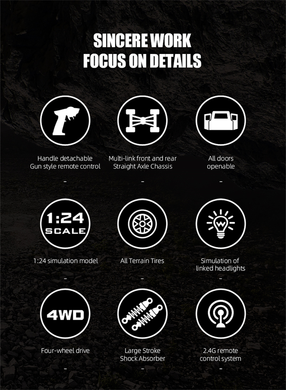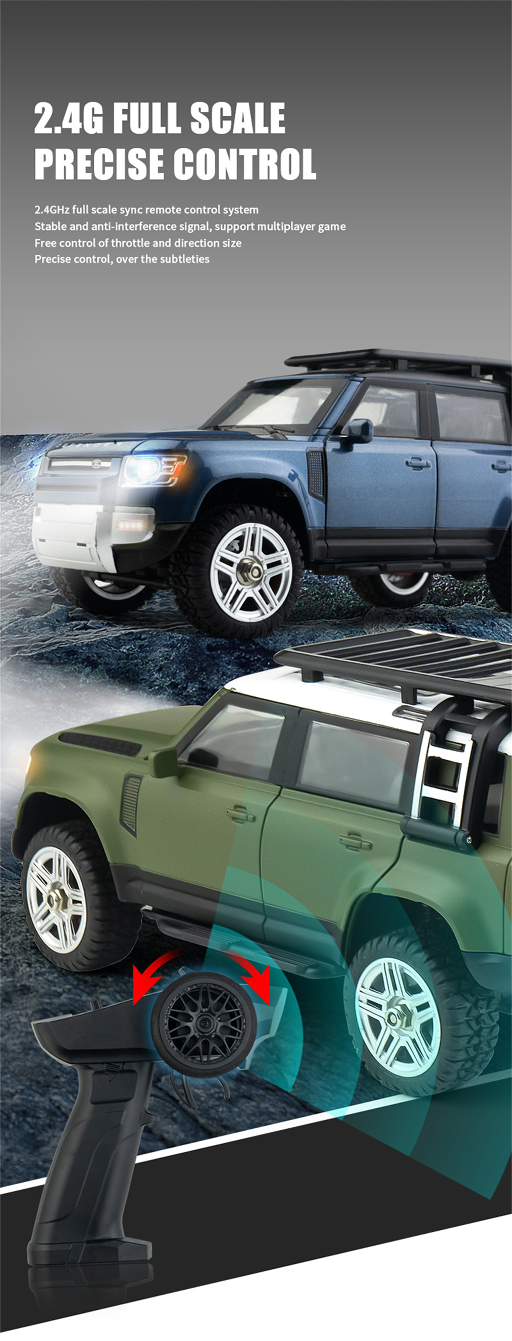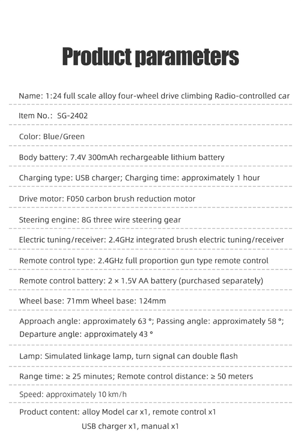 Tämä SG PINECONE FOREST 2402 on 1/24-mittakaavainen, nelivetoinen RC-auto, jossa on metallisia voimansiirto-osia, realistinen metallinen korikuori avautuvilla ovilla sekä monipuoliset valotoiminnot. Se soveltuu kokonsa ja nopeutensa ansiosta sekä sisä- että ulkokäyttöön.
