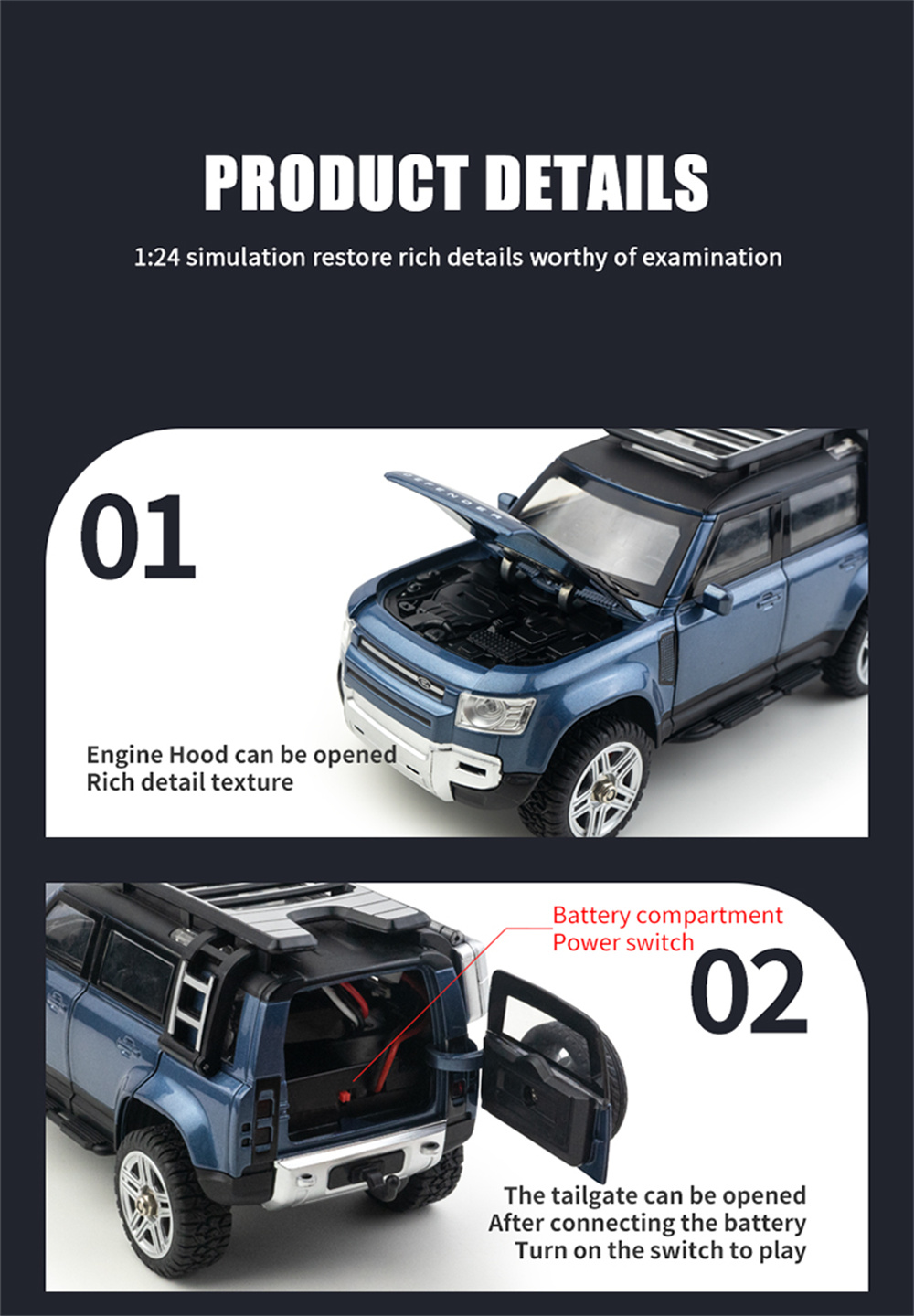 - Metallinen, aidon auton kaltainen korikuori, jossa avattavat ovet, konepelti, tavaratila ja jarrulevyjen yksityiskohdat.