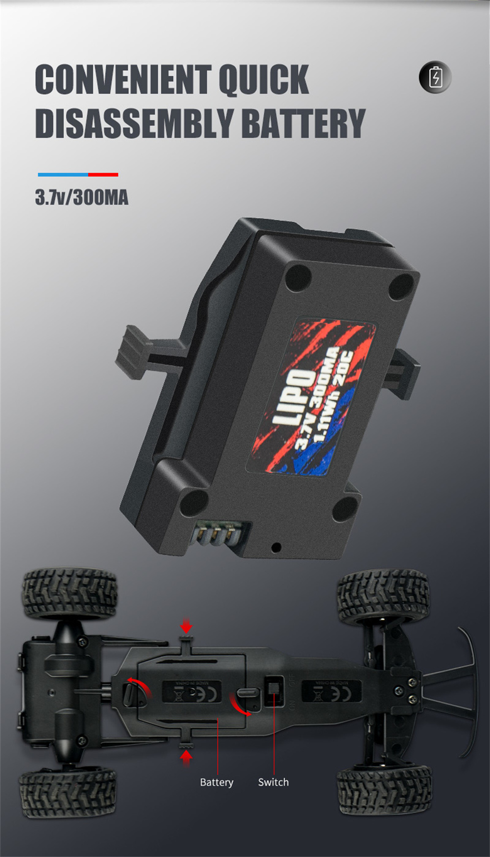 Akku | Auton akku: 3.7V 300mAh litiumioniakku (sisältyy) Akun latausaika: noin 50 minuuttia Toiminta-aika yhdellä latauksella: noin 15–20 minuuttia |