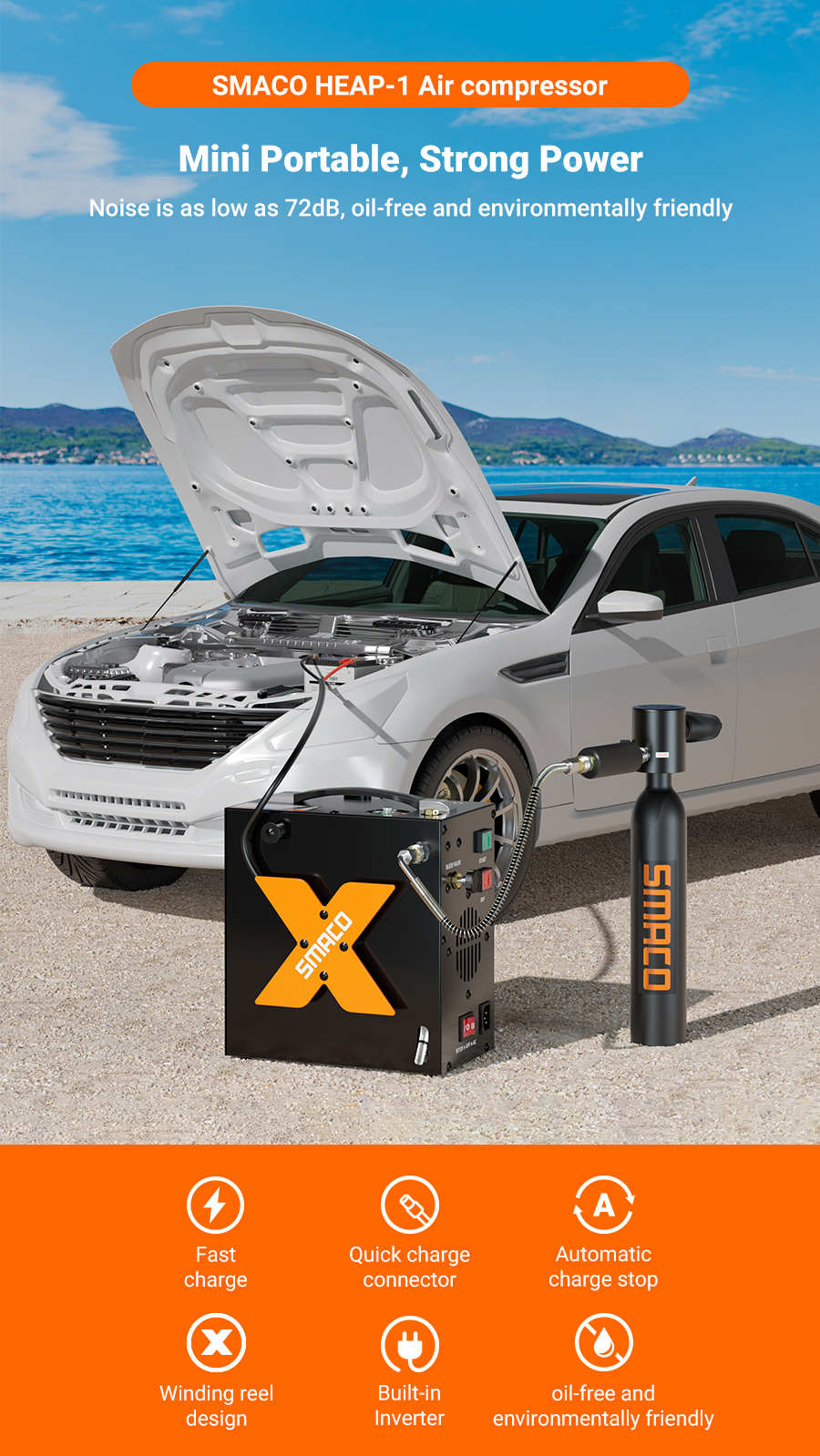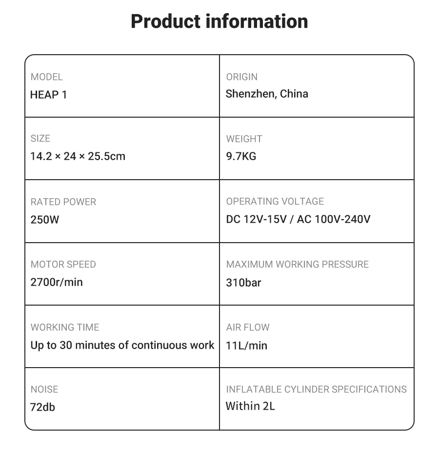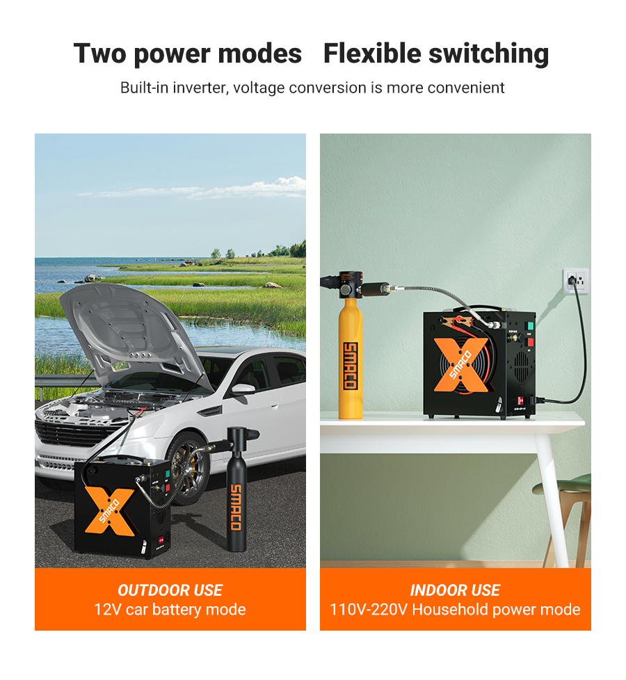 1. Sisäänrakennettu virtalähde ja helppo liitäntä: Muuntaja ja kompressori on integroitu samaan laitteeseen, joten erillistä muuntajaa verkkokäyttöä varten ei tarvita ja käyttö on turvallisempaa. SMACO-sukelluspullokompressori voidaan käyttää 12V auton akusta tai kytkeä kotikäyttöön 110V-220V vaihtovirralla. Tämä tekee kompressorista monikäyttöisen sekä koti- että ulkokäytössä.