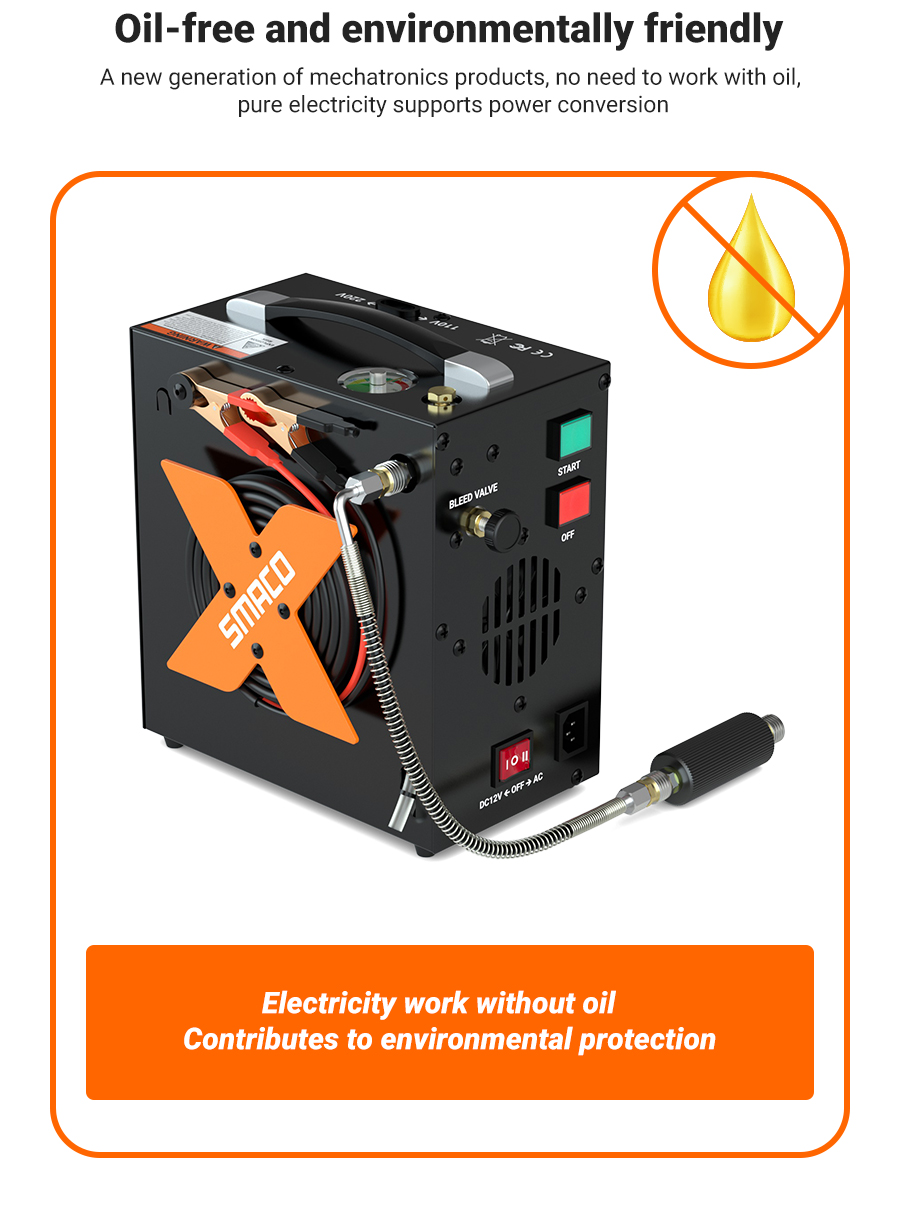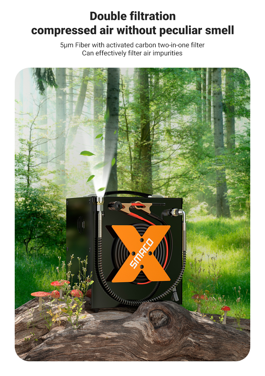 3. Kaksinkertainen suodatus ja öljytön rakenne: SMACO paintball-ilmakompressori käyttää tuuletinjäähdytystä eikä tarvitse öljyä, joten käyttö on siistiä eikä erillistä vesipumppua jäähdytykseen tarvita. Mukana on öljy-vesierotin, jossa 5 μm kuitu- ja aktiivihiilisuodatin yhdessä suodattavat tehokkaasti kosteutta ja epäpuhtauksia ilmasta, jolloin ulostuleva paineilma on puhdasta ja kuivaa.