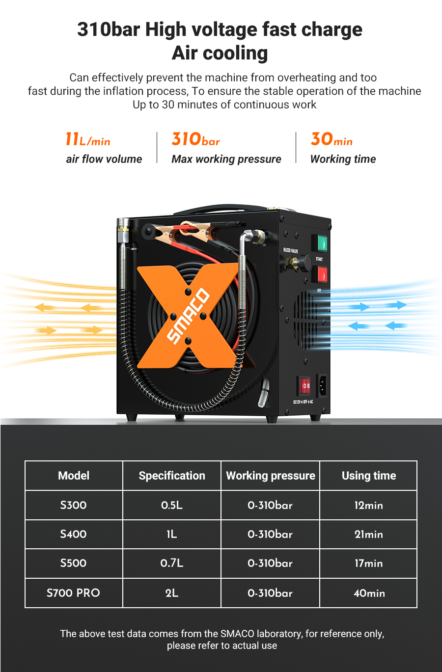 SMACO korkeapainekompressori 4500psi/30MPa sukelluspulloille öljytön äänetön automaattisammutus 12V/110-220V