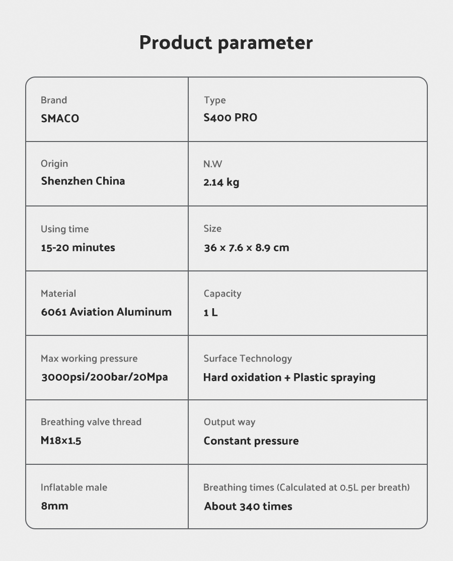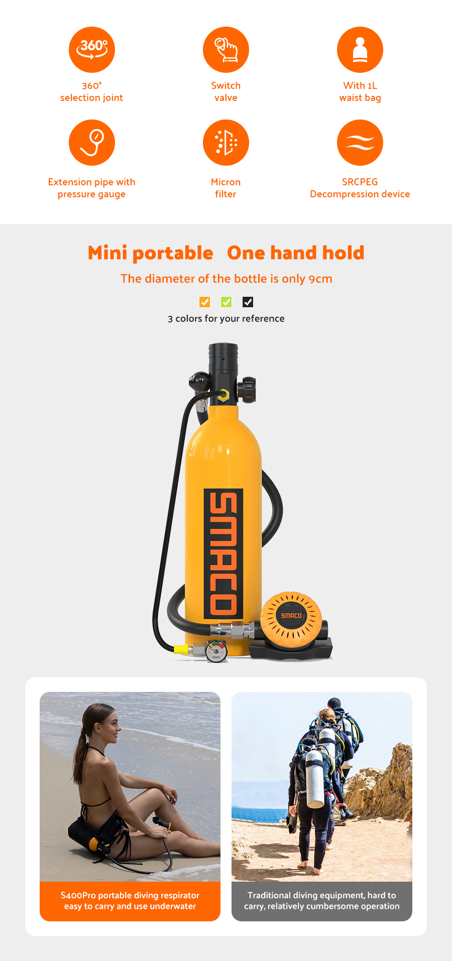 SMACO S400 Pro 1L pieni sukelluspullo hätähengityslaite sukellusvaruste