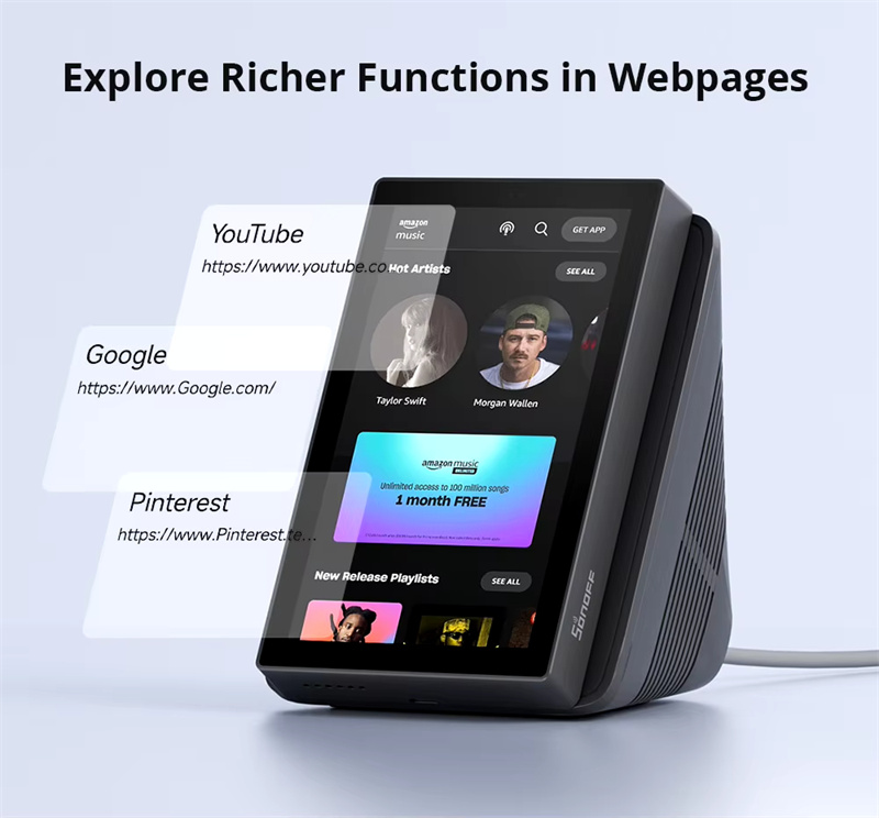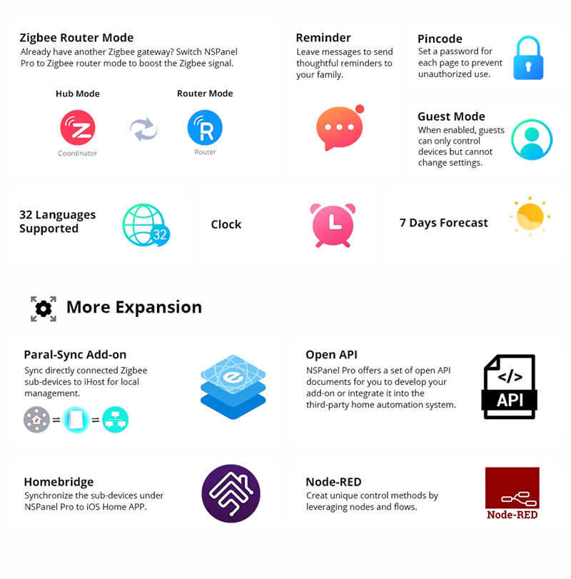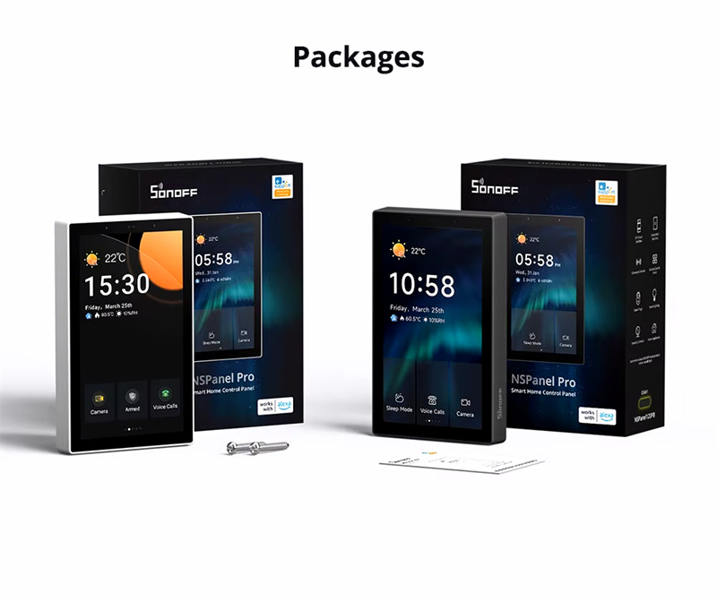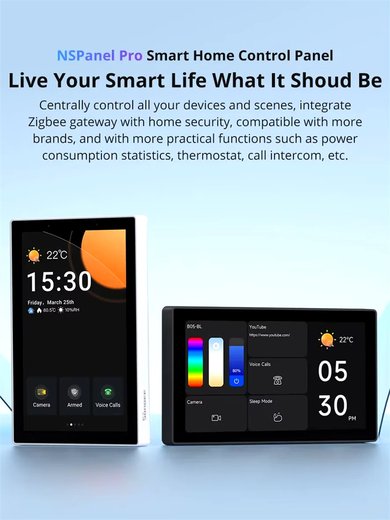SONOFF NSPanel Pro on älykäs skenaario-ohjauspaneeli, jossa on kosketusnäyttö, Zigbee-keskitin ja turvaominaisuudet. Paneelista voi ohjata laitteita widgettien avulla, lisätä Zigbee-alilaitteita sisäänrakennetun Zigbee 3.0 -yhdyskäytävän kautta, asettaa turvatiloja ja katsoa kameran live-näkymää. Se tukee laajasti SONOFF-laitteita sekä kolmannen osapuolen laitteita, ja tarjoaa käytännöllisiä toimintoja kuten energiankulutuksen seuranta, termostaatti, puhelu- ja sisäpuhelutoiminnot.