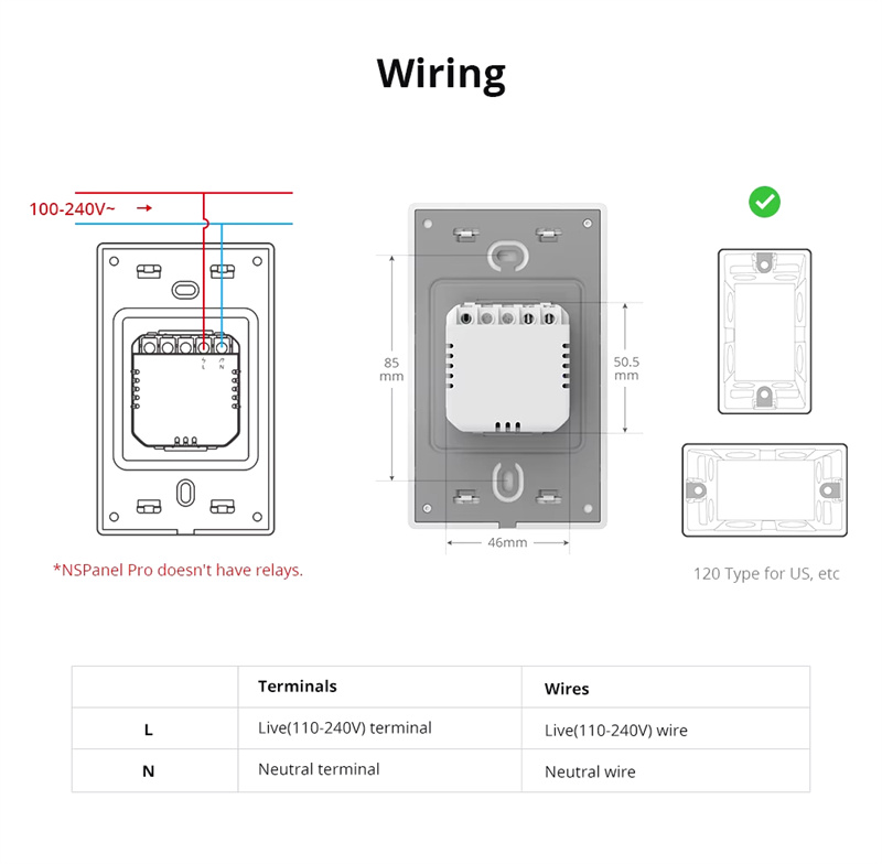SONOFF NSPanel Pro: 120*74CM (US). Tätä ei voi asentaa suoraan seinään Euroopassa, sen voi käyttää pöytätelineen kanssa (esim. SONOFF Stand Base) tai asentaa seinään poraamalla asennusaukko itse.