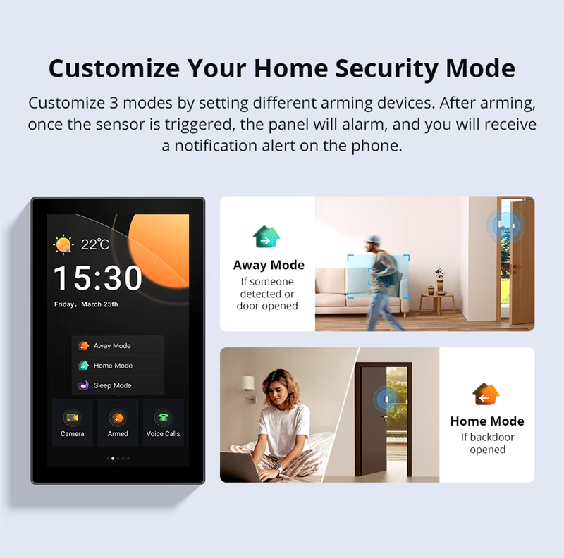 4. Lisää Zigbee-laitteita nopeasti myös erissä. Zigbee 3.0 tarjoaa vakaan yhteyden ja laajemman peiton. Yhteensopiva ääniohjauksen kanssa (Alexa, Google Home). Mukauta 3 turvatilaa, hälytys paneelissa ja ilmoitus puhelimeen anturin lauetessa. Muokkaa aloitusnäytön tyyliä tai taustakuvaa.