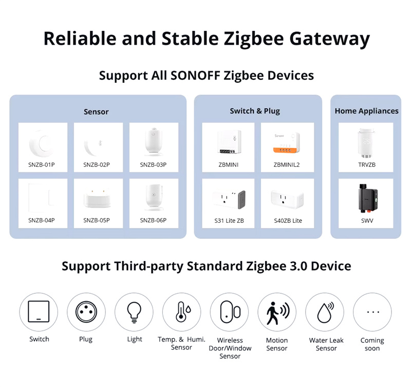 2. Tukee kaikkia SONOFF-laitteita (älyvalot, kamerat, turva-anturit, kytkimet jne.) ja tuki laajenee uusiin SONOFF-laitteisiin jatkossa.