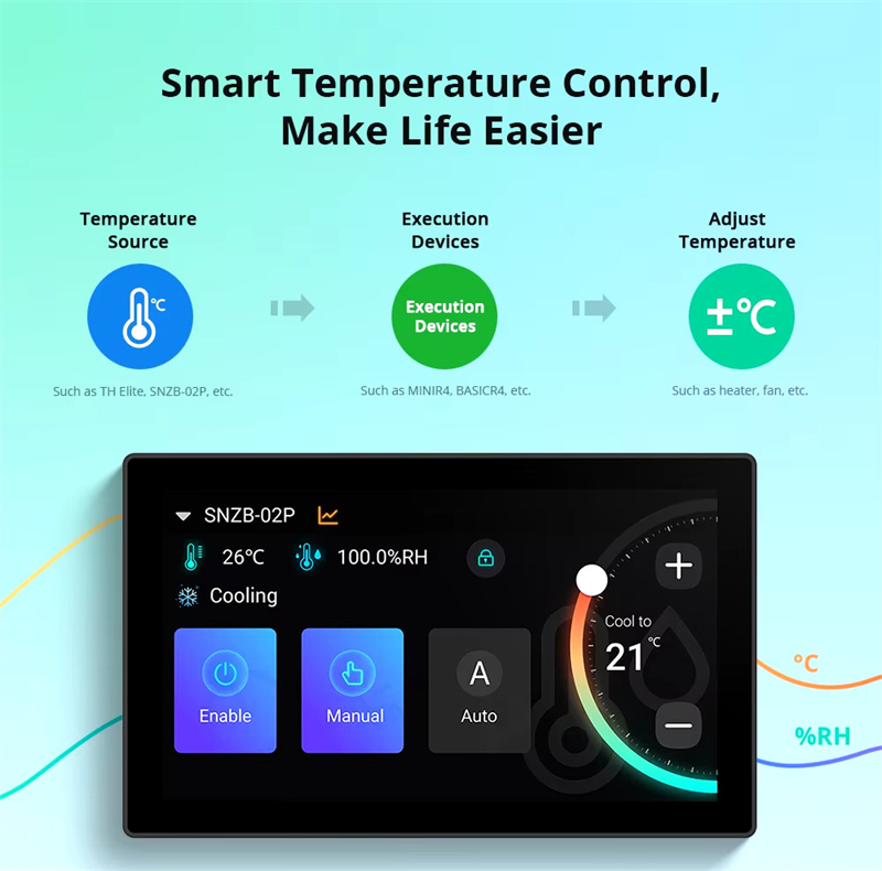 5. Luo oma termostaatti valitsemalla lämpötilalähde ja ohjattavat laitteet. Yhteistyö älykameran kanssa: tarkista tulijat kamerasta ja varmista turvallisuus, tuki kaksisuuntaiselle puheelle. Sisäänrakennetun mikrofonin ja kaiuttimen ansiosta puhelut puhelimesta paneeliin ja paneelien välillä.