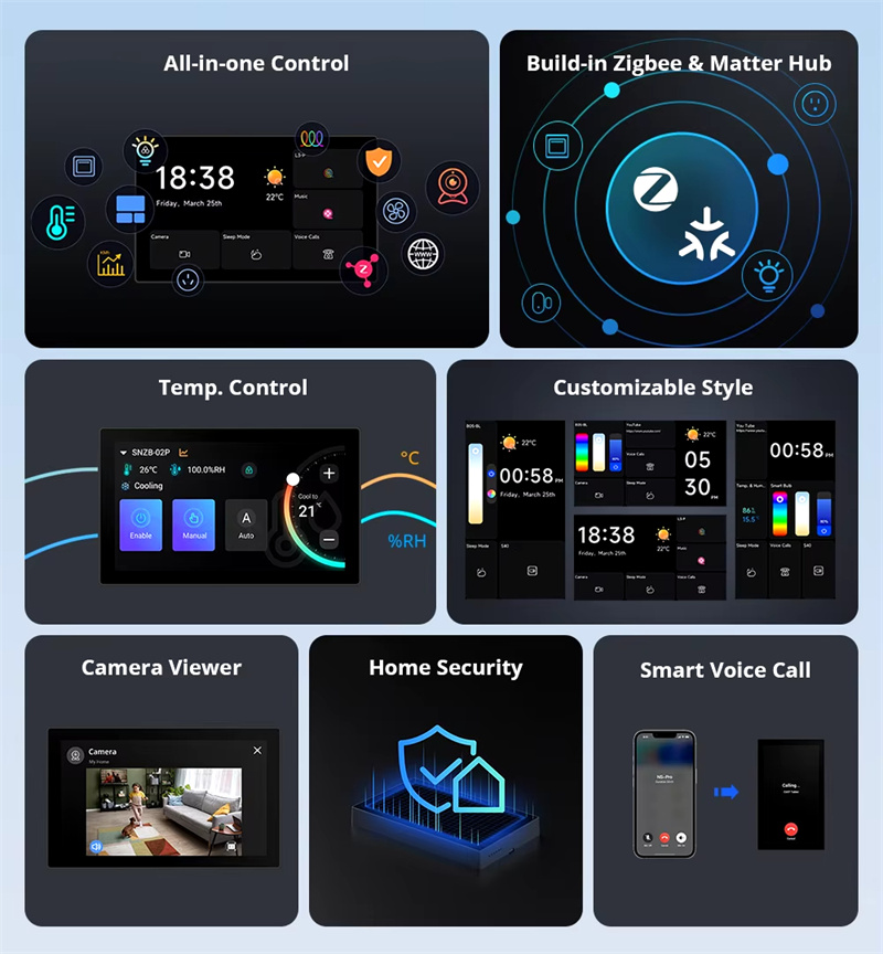 1. Älykäs hallintapaneeli, jossa kosketusnäyttö, Zigbee-keskitin ja turvatoiminnot: lisää laitteita widgetteinä, liitä Zigbee 3.0 -alilaitteita, määritä turvatilat ja katso kameran live-näkymää paneelissa. Tuki myös energiankulutukselle, termostaatille, puhelu-/sisäpuhelulle ym.