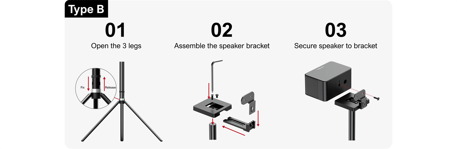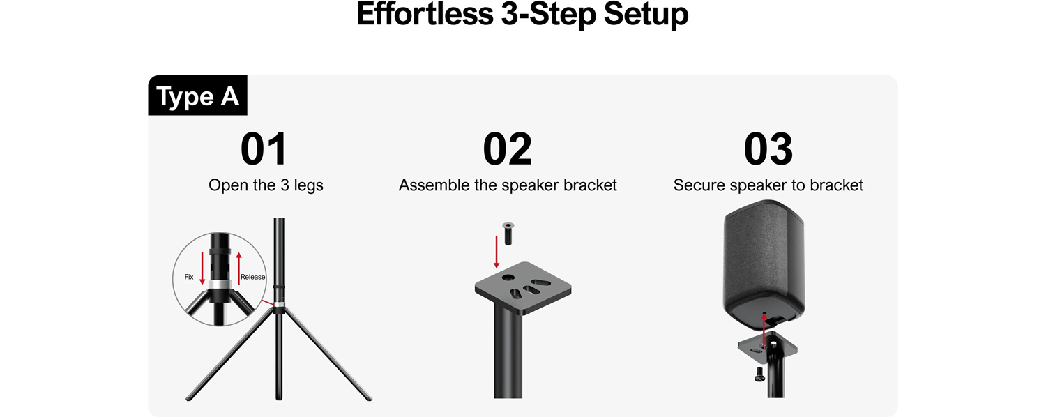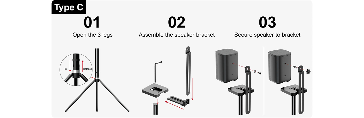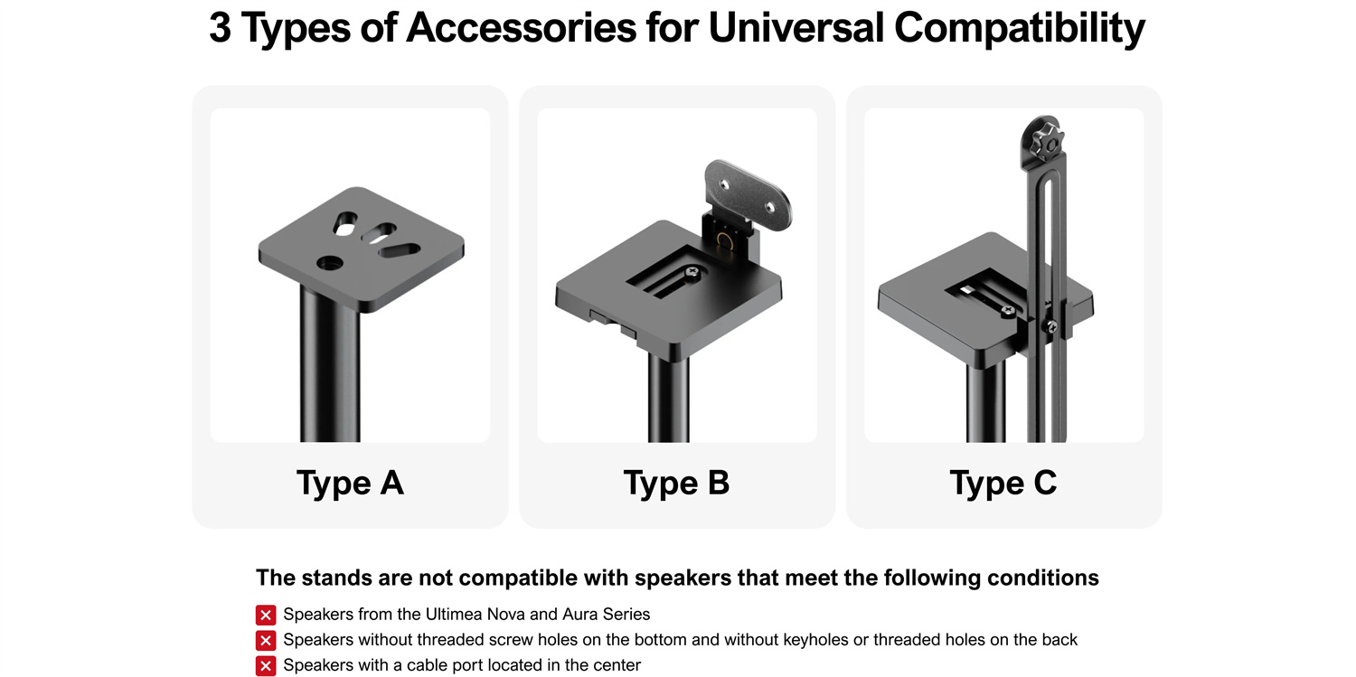 Sisältää 3 tarviketyyppiä (Type A, B, C) erilaisiin kaiuttimien kiinnitystarpeisiin.