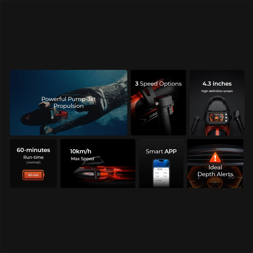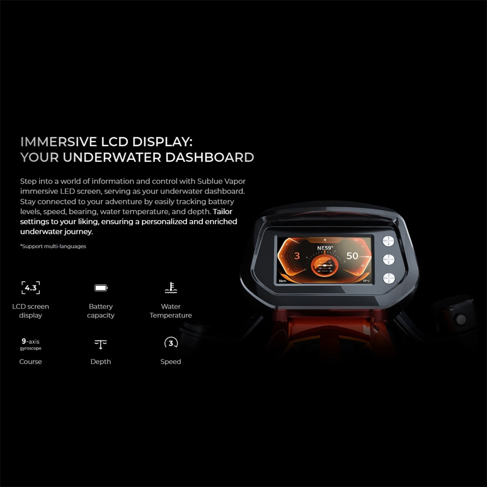 - 4.3-tuumainen LCD-näyttö: selkeä 4.3' näyttö, josta voit helposti seurata akun varaustasoa, nopeutta, suuntaa, veden lämpötilaa ja syvyyttä, jolloin tiedot tukevat sukelluskokemustasi.