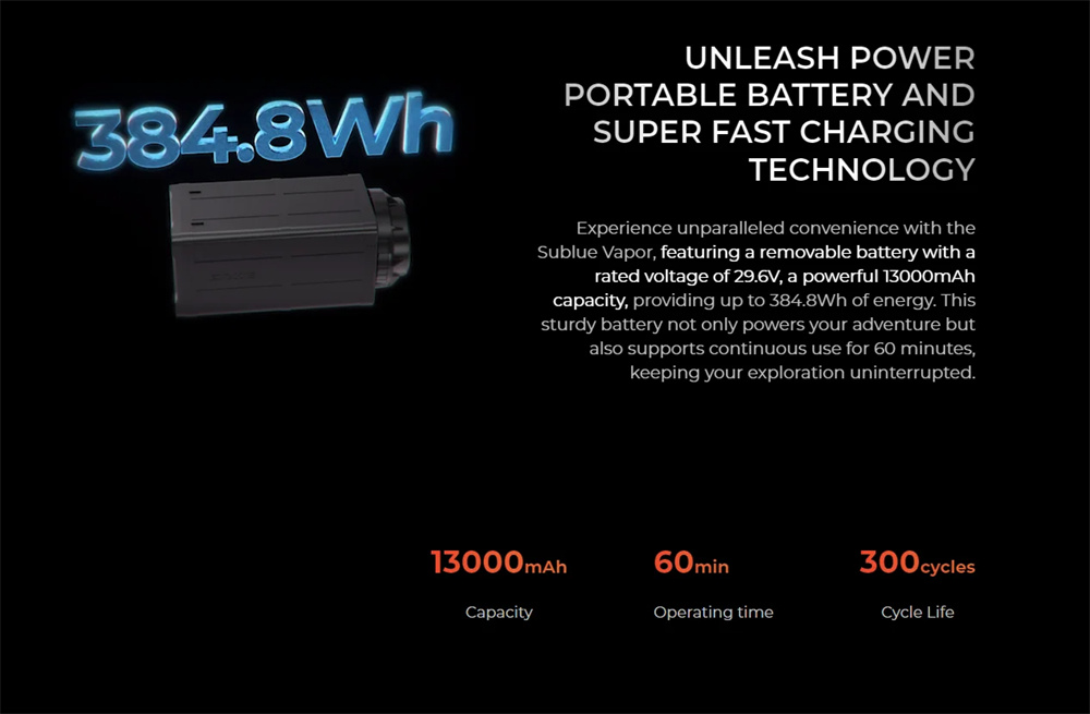 - 60 minuuttia käyttöaikaa: irrotettava 13000mAh akku tarjoaa jopa 60 minuuttia käyttöä. Vaihde 1: noin 45 minuuttia, vaihde 2: noin 30 minuuttia, vaihde 3: noin 18 minuuttia. Akun latausaika on 3 hours, ja pikalaturilla latausaika lyhenee 1.5 hours -arvoon.