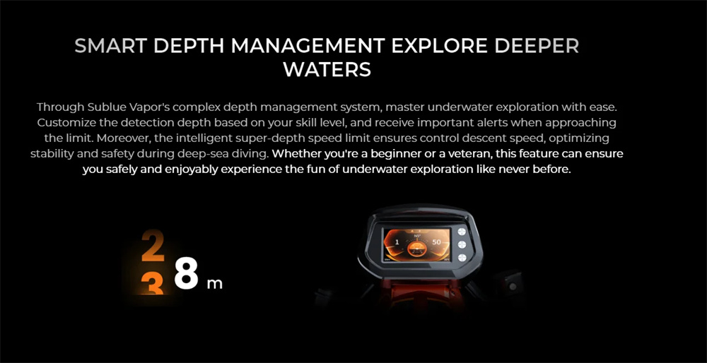 - Syvyyshälytyksen asetus: Vaporin syvyyshälytys lisää turvallisuutta. Voit asettaa haluamasi syvyysarvon, kun todellinen syvyys saavuttaa asetetun rajan, näyttöön tulee varoitus ja moottori pysähtyy, kunnes syvyys palaa sallittuun arvoon.