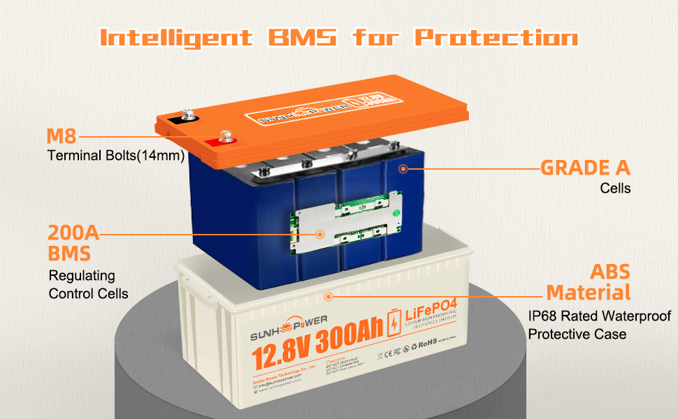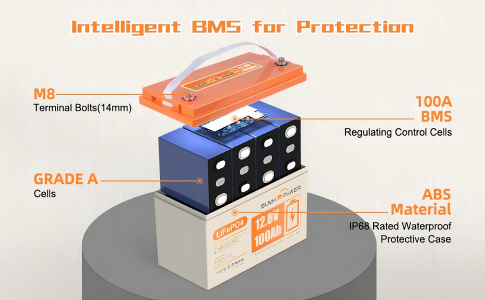 - Sisäänrakennettu BMS: 12.8V 100Ah/200Ah malleissa 100A BMS, 12.8V 300Ah mallissa 200A BMS – suoja ylilataukselta, syväpurulta, ylikuormalta, ylivirrasta, ylikuumenemiselta ja oikosululta.