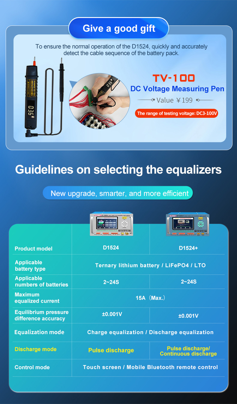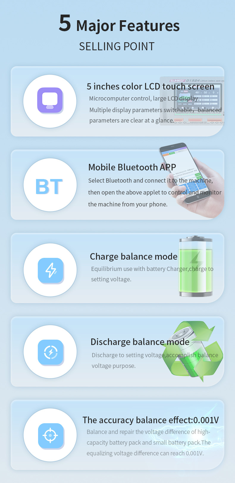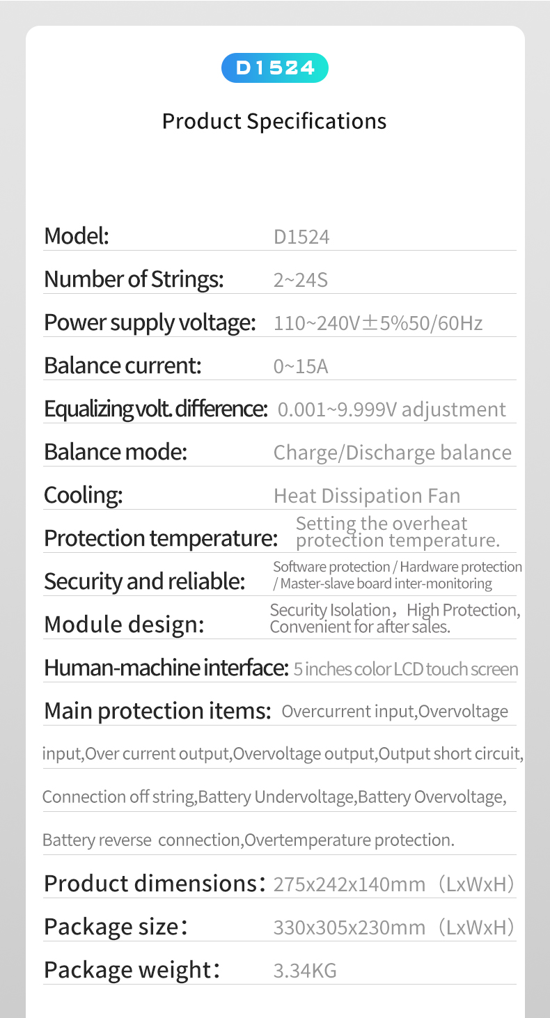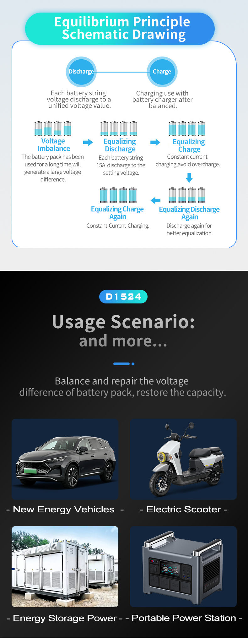 SUNKKO D1524+ 15A suuren virran litiumakkutasaaja ja -analysaattori soveltuu useille akkutyypeille, kuten kerrosrakenne-litiumakuille (ternäärinen litium), LiFePO4- ja LTO-akkuille. Soveltuu hyvin erilaisten akkupakettien hallintaan ja testaukseen.