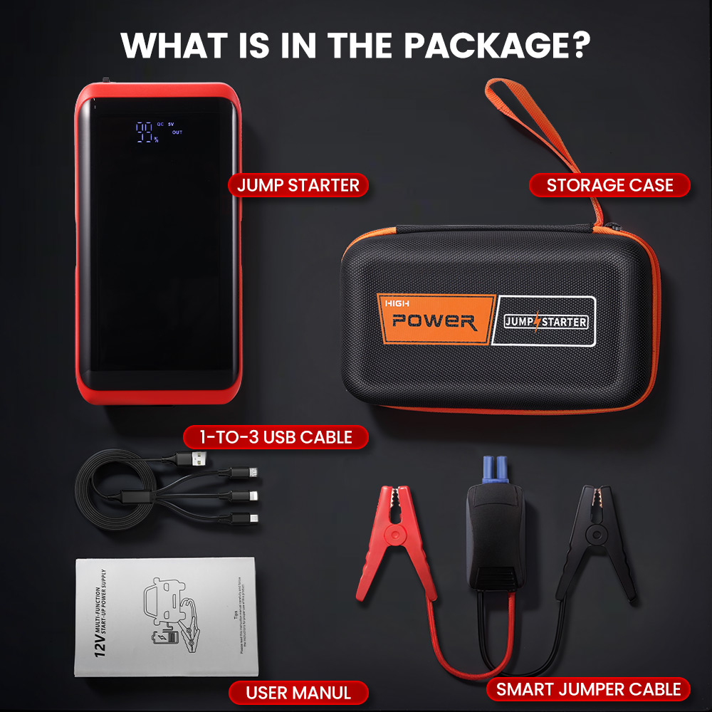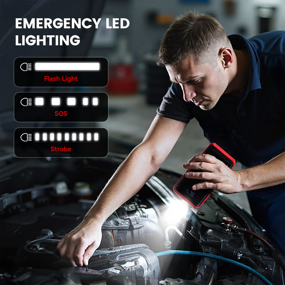 - Monikäyttöisyys: käynnistin, 3-tilainen LED-taskulamppu (>15 tunnin/48+ tunnin käyttöaika tilasta riippuen) ja varavirtalähde.