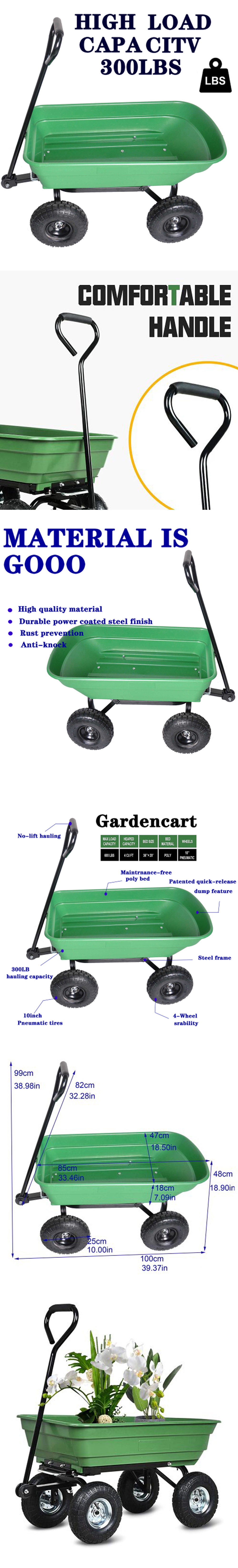 • Suuri kuormatilavuus: tasaisella alustalla kärry kantaa jopa 300 lbs, ja kallistettava lava mahdollistaa jopa 220 lbs kuorman kaatamisen helposti. Tilavuus riittää monenlaisten puutarha- ja pihatöiden tarpeisiin.