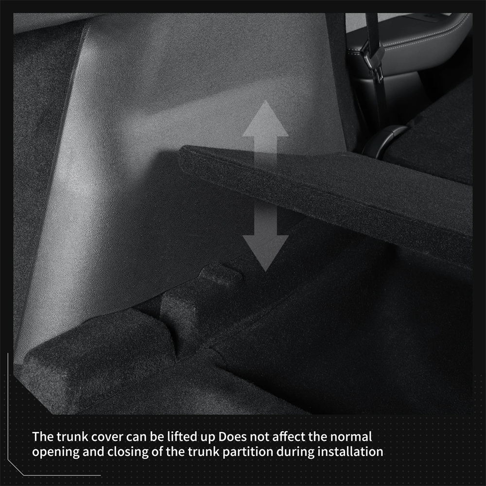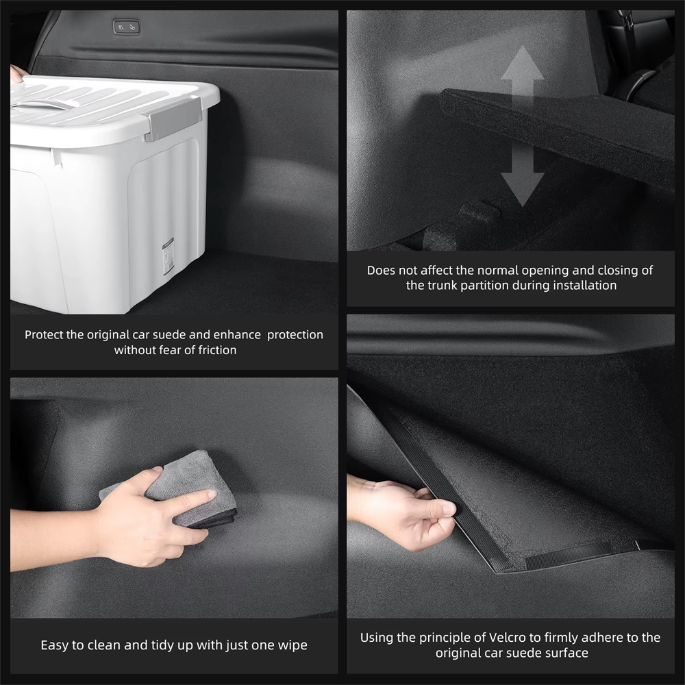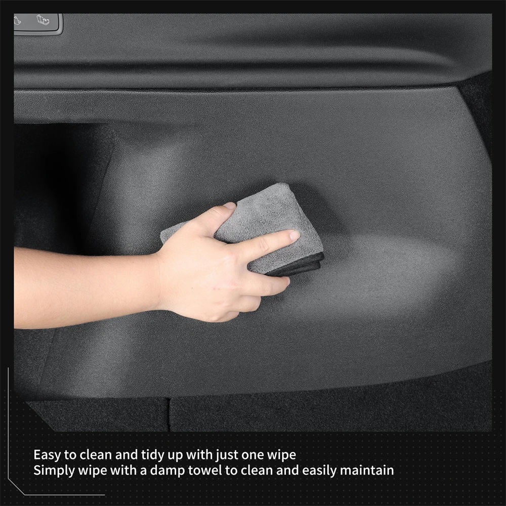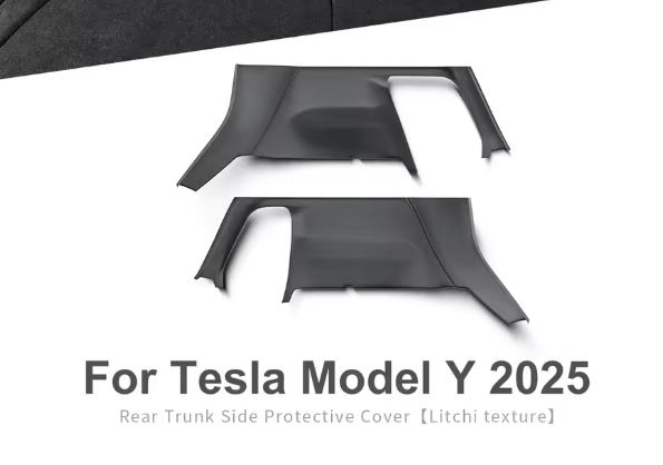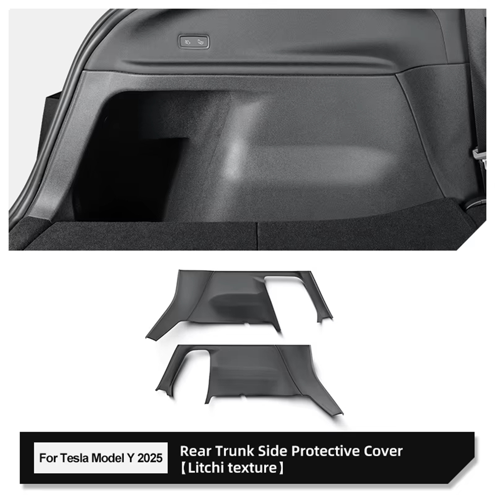 Takakontin sivujen suojapaneelit tarjoavat siistin, alkuperäisen verhoilun näköisen ratkaisun, joka suojaa Tesla Model Y 2025 -mallin takatilan sivuja naarmuilta, lialta ja kulumiselta.