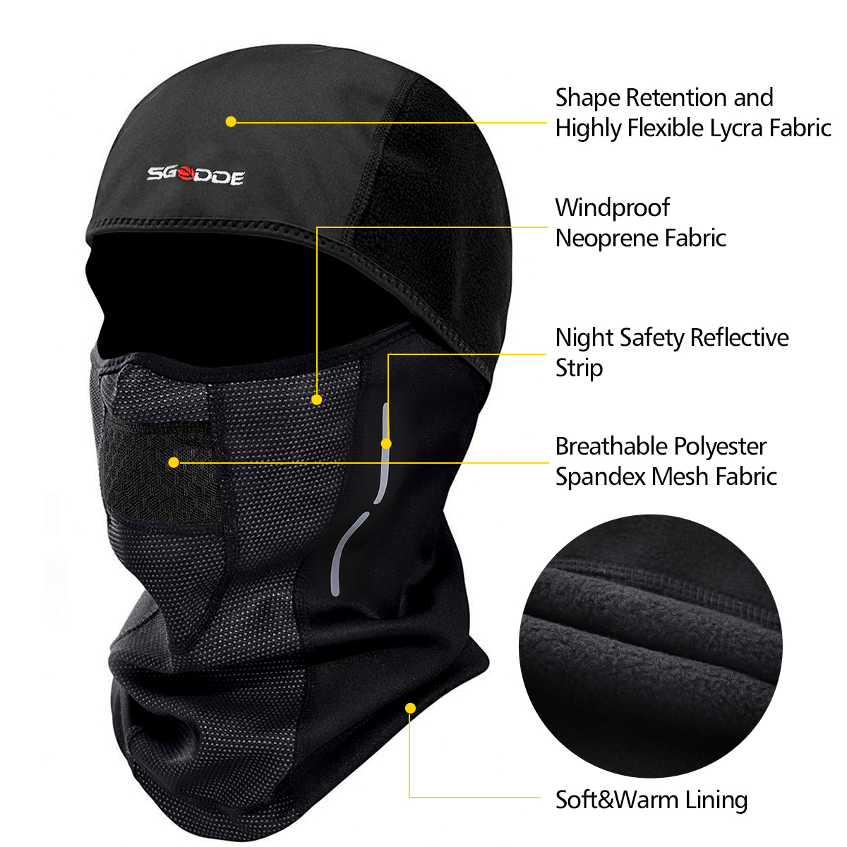 Lämmittää ja suojaa laskettelussa, moottoripyöräilyssä, juoksussa, pyöräilyssä, patikoinnissa, kiipeilyssä, lumilautailussa, muovikuulapeleissä, värikuulapeleissä, metsästyksessä, taktiikkaharjoittelussa ja muissa ulkoilulajeissa. Suojaa kylmältä, tuulelta, pölyltä ja auringon UV-säteiltä. Sopii sekä naisille että miehille.