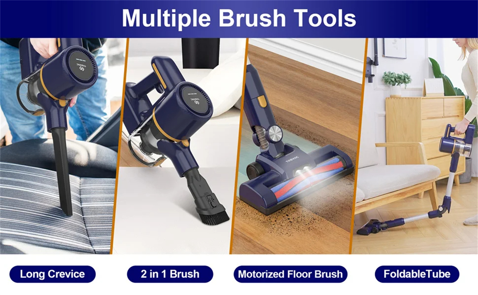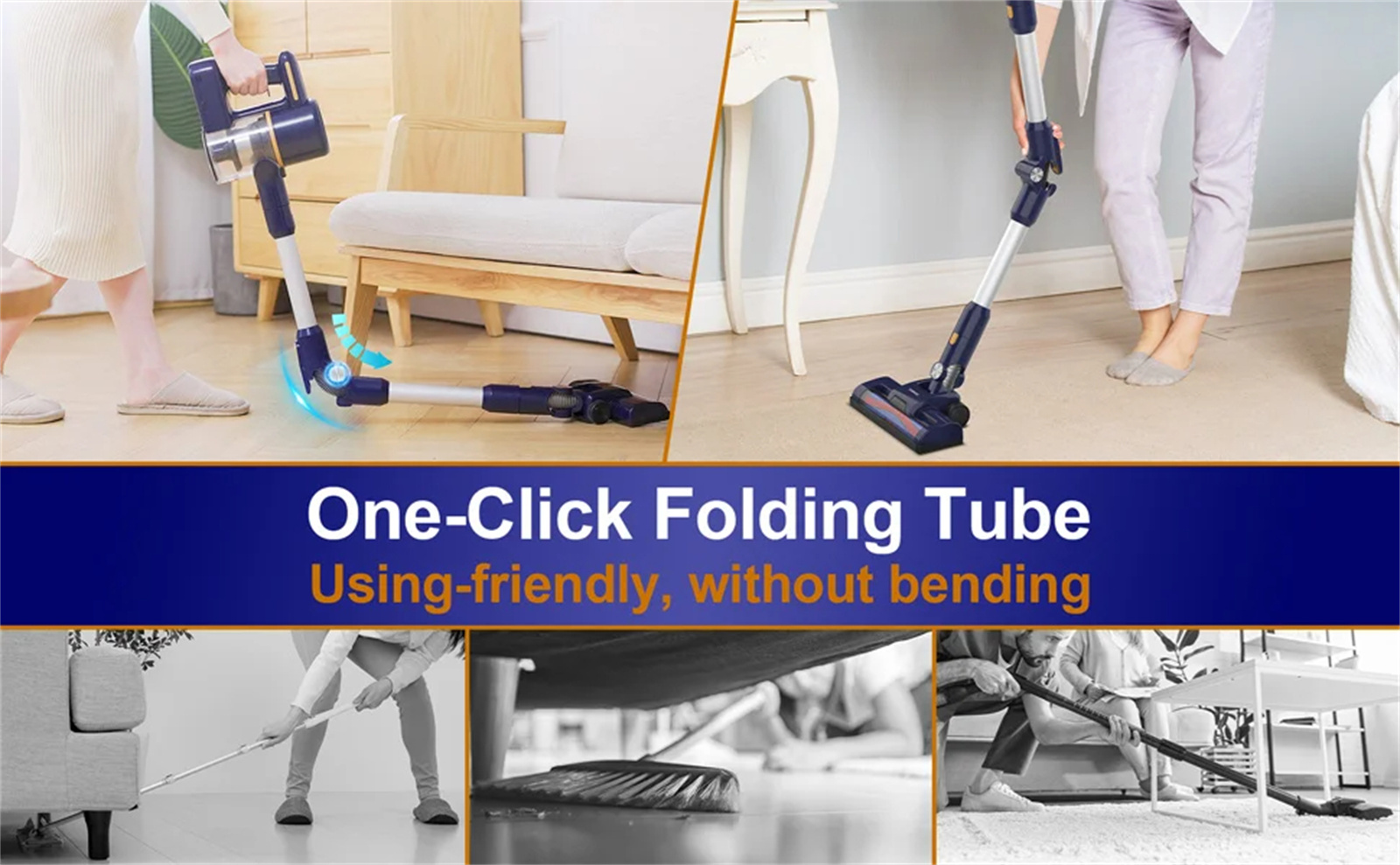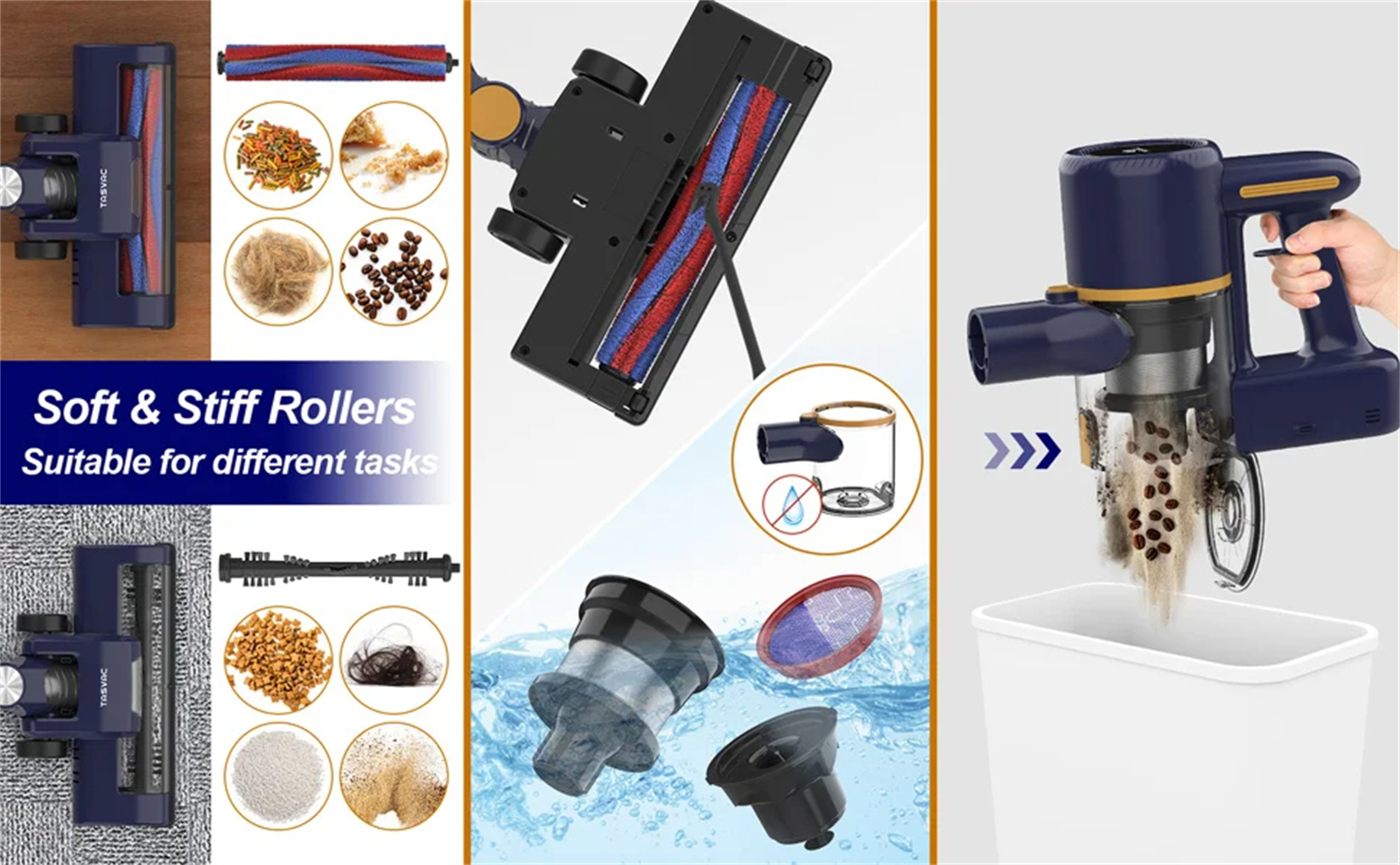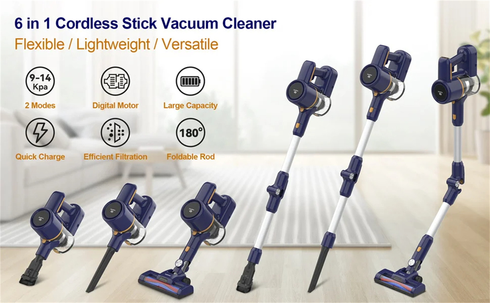 1. Tehokas imuteho: Langattomassa pölynimurissa on päivitetty moottori ja sisäänrakennettu 6x2200 mAh akku. Kaksi tehotilaa, imuteho jopa 14000 Pa, kerää lian kuten lemmikkikarvat ja kissanhiekan kovilta lattioilta ja matalilta matoilta. Standardinopeudella käyttöaika on 20–40 minuuttia.