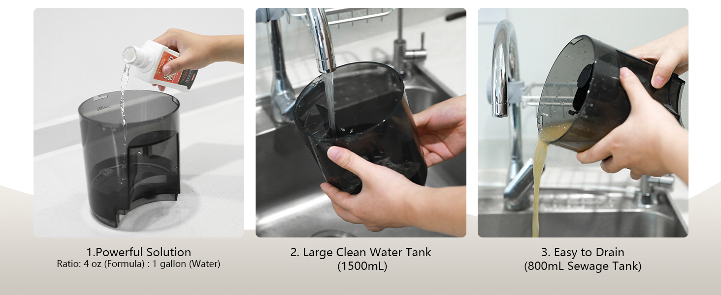 W07 & C5: Suuret 1500 ml puhdasvesisäiliöt, sopivat laajojen alueiden puhdistamiseen. |