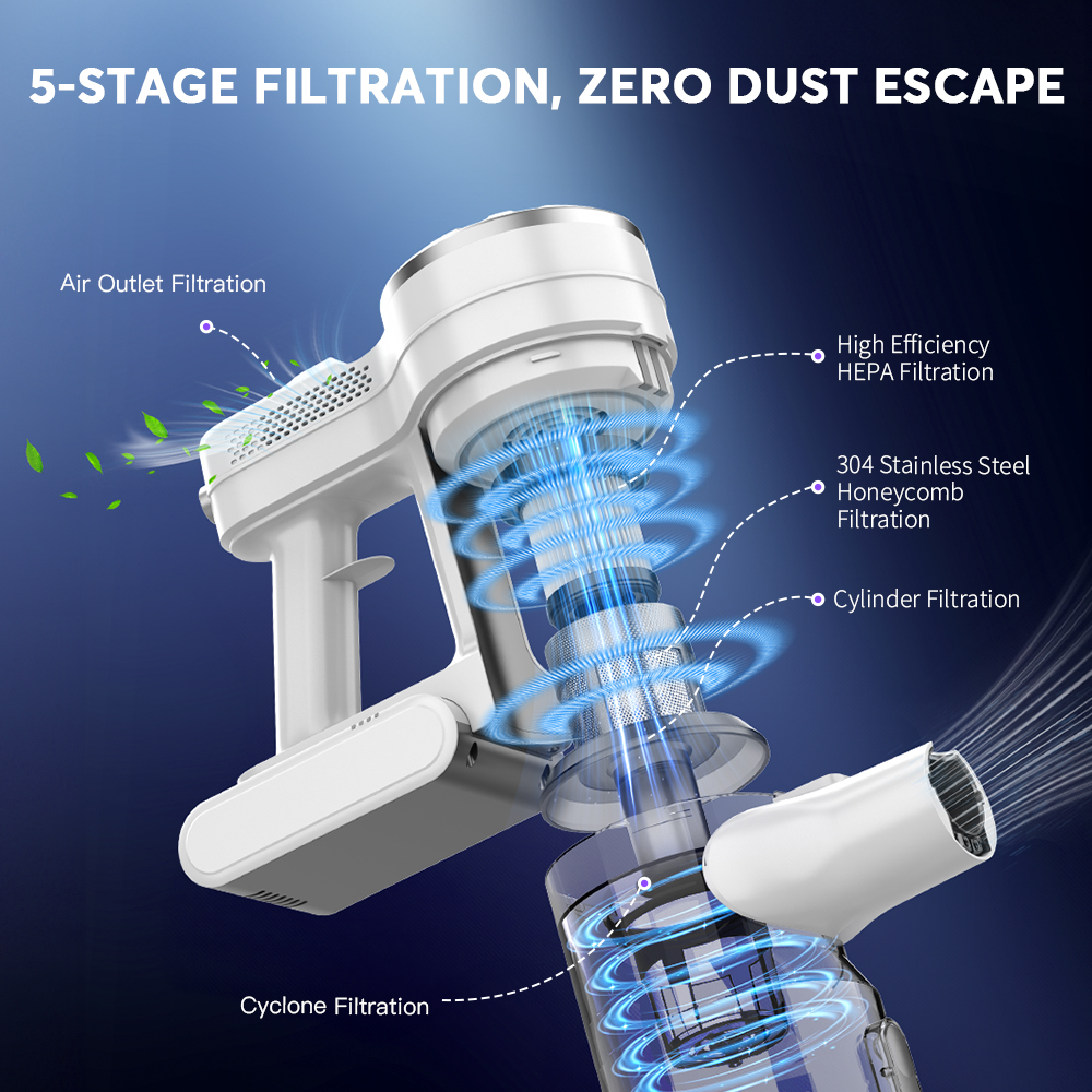 Edistynyt monikerrossuodatus (syklonisuodatin, ruostumattomasta teräksestä valmistettu suodatin, HEPA jne.) vangitsee 99.99 % hienopölystä ja allergeeneista, mikä edistää puhtaampaa sisäilmaa.