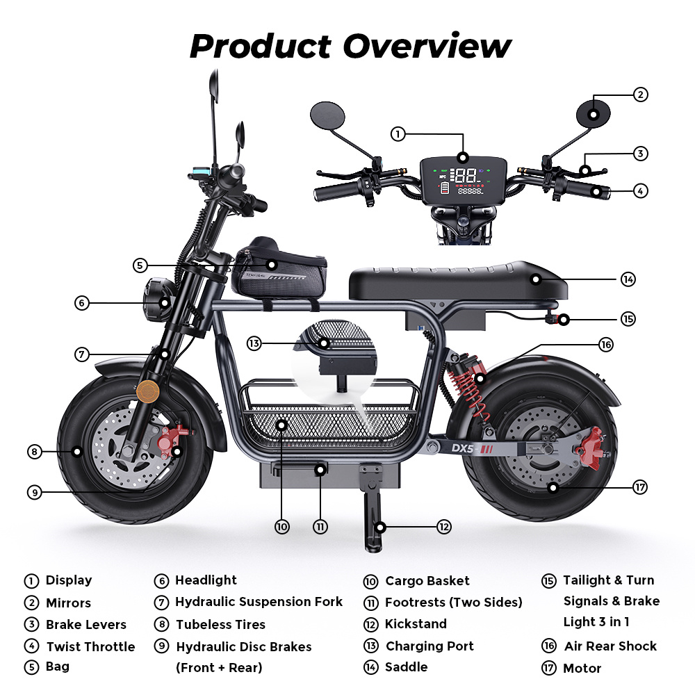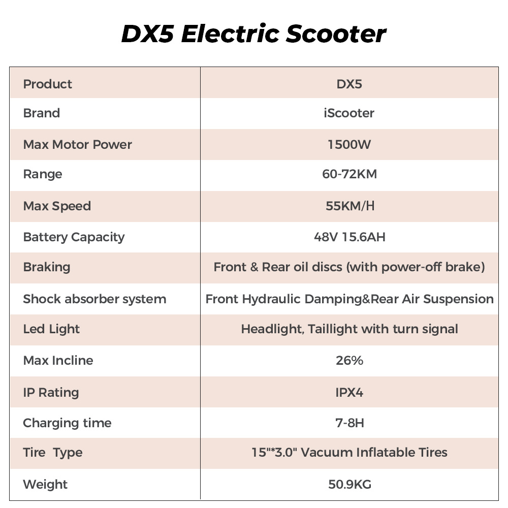 iScooter DX5 on tehokas sähköpotkulauta päivittäiseen ajoon ja pidemmillekin matkoille. Suuri akku, tukeva alusta ja jousitus edessä ja takana tuovat ajomukavuutta, kun taas hydrauliset levyjarrut varmistavat jämäkän pysähtymisen.