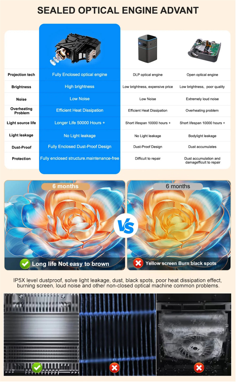 | Tekniikka | Uuden sukupolven täysin suljettu optinen LED-koneisto |