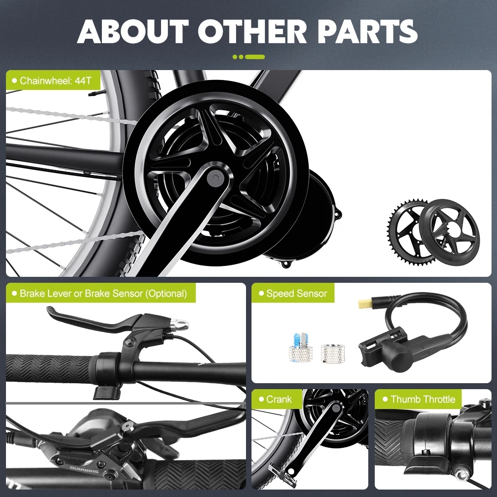 - Sisältää tarvittavat osat perusasennukseen: moottori, eturatas, näyttö, jarrukahvat, peukalokaasu, kampisarja ja nopeusanturi