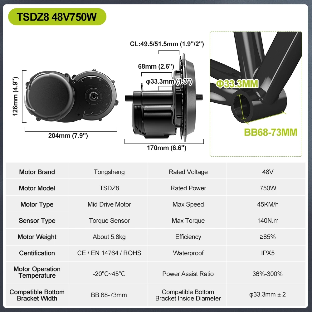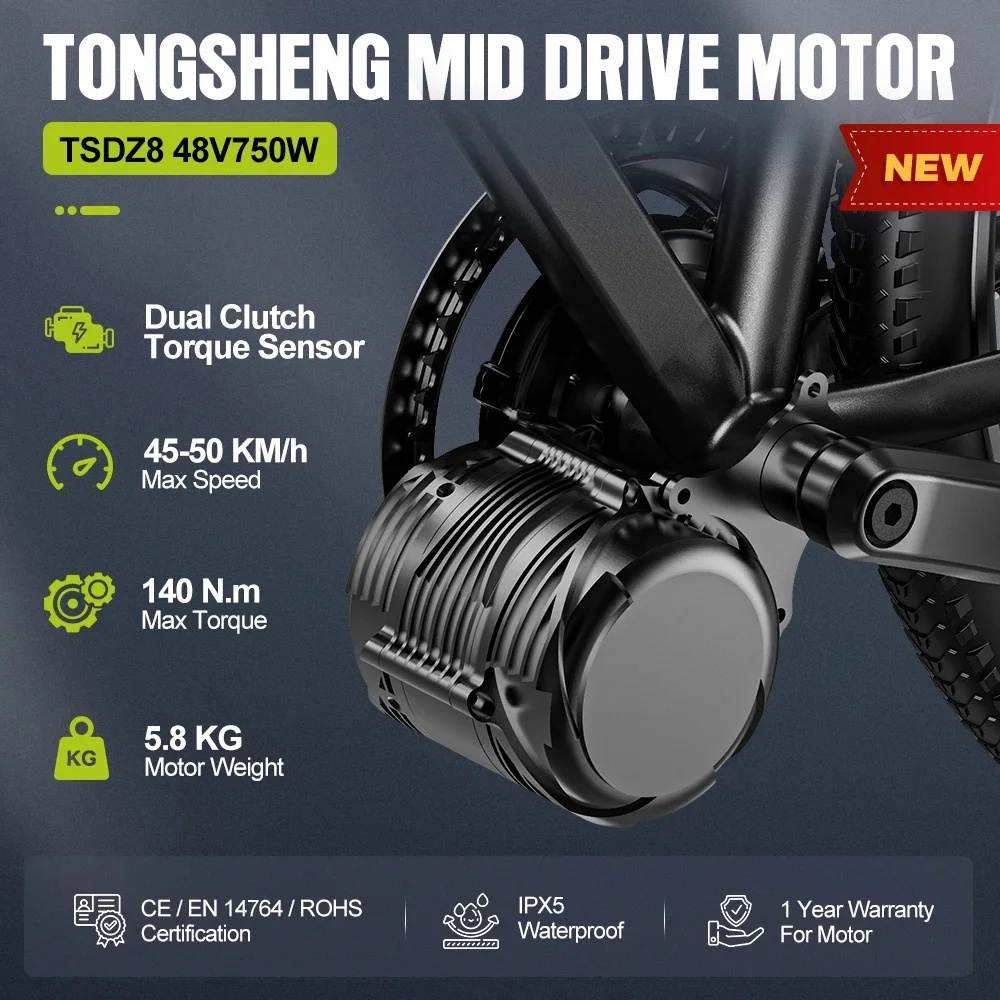 TONGSHENG TSDZ8 on tehokas keskimoottoripaketti 48V750W teholuokassa, suunniteltu päivittämään tavallinen polkupyörä tasaisen ja luonnollisen tuntuiseksi sähköpyöräksi. Vääntömomenttiin perustuva avustus säätää tehon poljinvoimasi mukaan, mikä tekee ajamisesta hallittua niin kaupungissa, työmatkoilla kuin mäkisillä reiteillä.