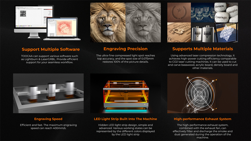 TOOCAA L2 Laser Engraver hyödyntää erittäin pientä, 0.15 mm:n valopistettä. Se mahdollistaa tarkan kaiverruksen, jossa yksityiskohdat toistuvat selkeästi ja kuvan yksityiskohdat säilyvät.